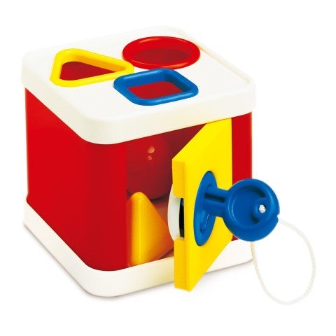 Този цветен куб/сортер разполага с 6 фигури в 3 различни цвята: триъгълник, кръг и квадрат, както и една вратичка с ключалка, която се отваря с помощта на прикрепения към него ключ. Тази игра ще помогне на децата да развият двигателните си умения, да научат цветовете и различните форми. Изработена е от здрава пластмаса и е удобна за пренасяне от стая в стая.