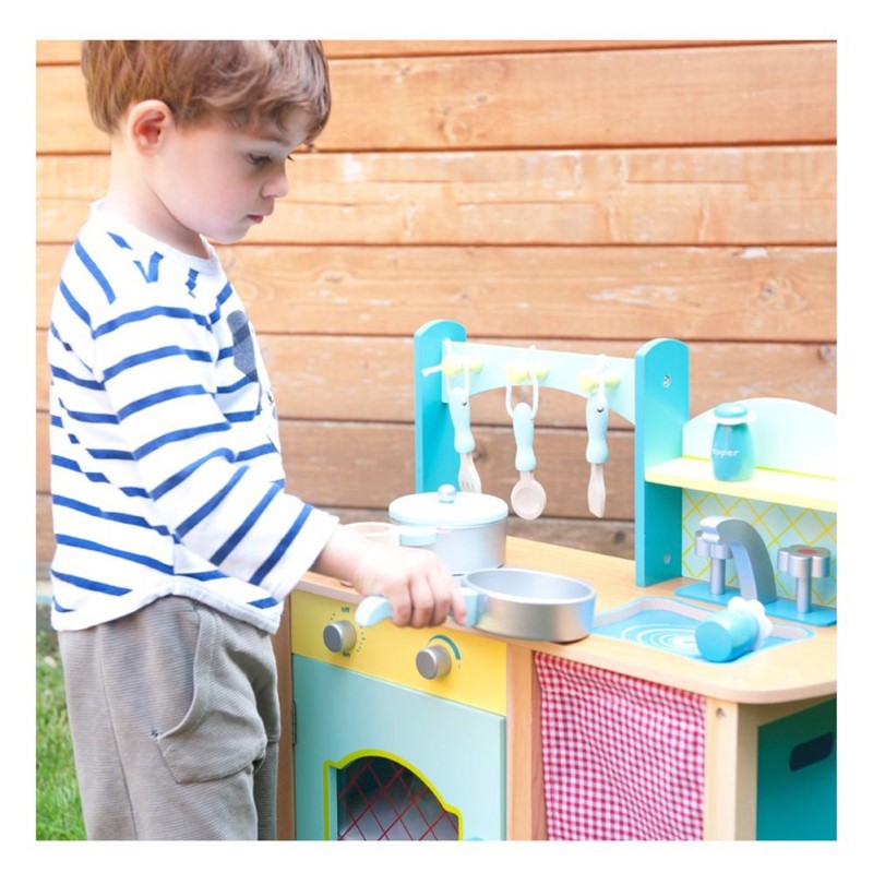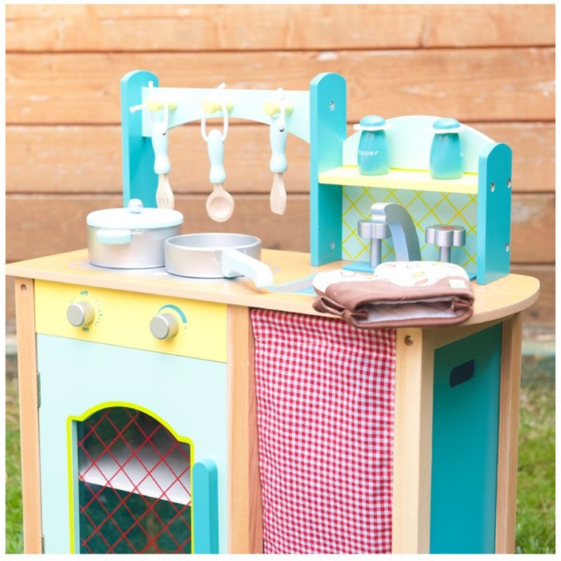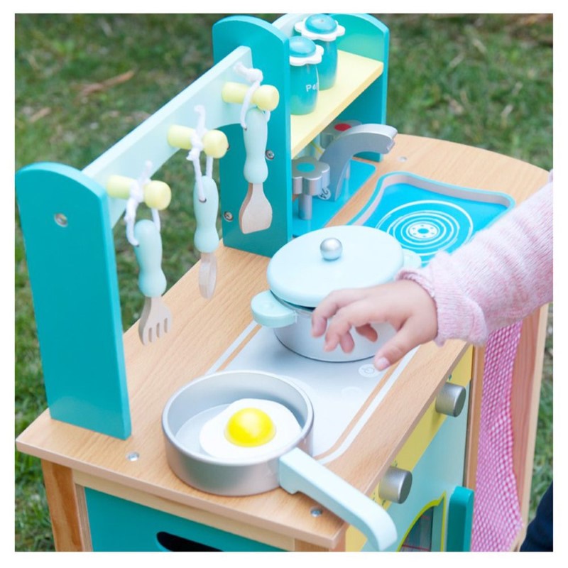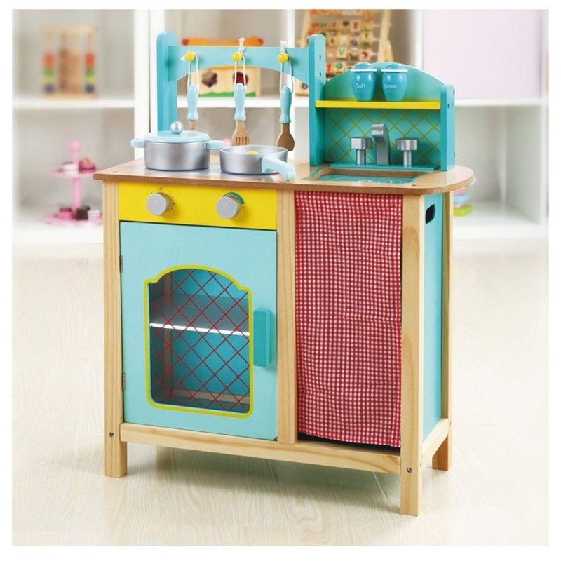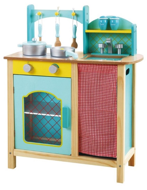 Детската кухня е изработена от дърво. Тя има красива и здрава конструкция, копчетата се въртят и издават реалистичен щракащ звук. Също така разполага с подвижна мивка, която лесно може да се почисти.