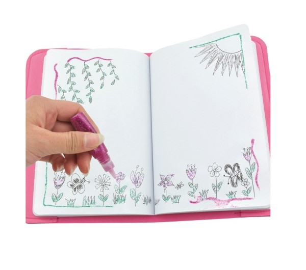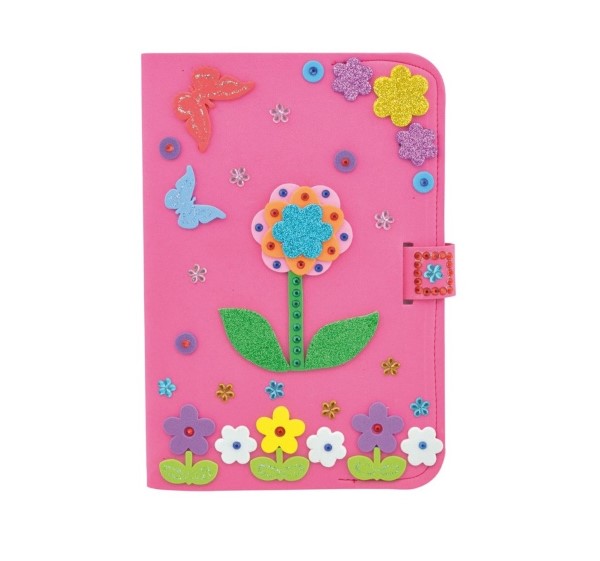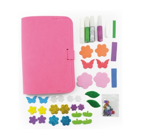 Няма по-хубаво нещо от това, сами да украсите любимия си тефтер по свой собствен дизайн. Този комплект ще ви позволи това и съдържа всичко от което се нуждаете: * тефтер с подвързия, тип ЕВА; * лепило; * блестящо лепило; * различни формички за апликация; * пинсети;