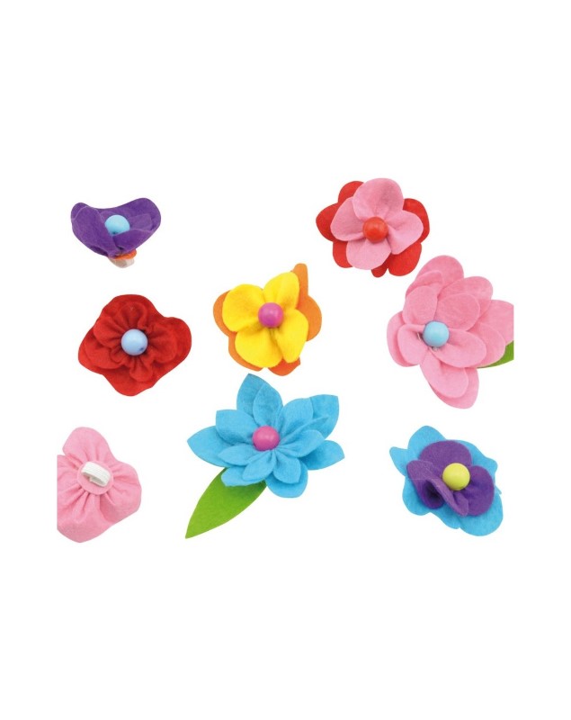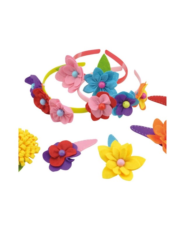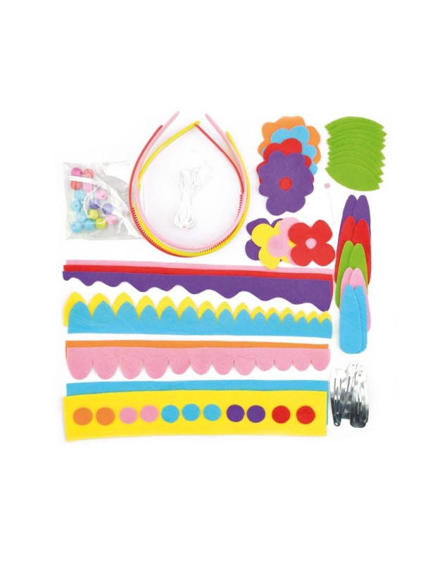 Всяка малка госпожица иска да е красива. С този комплект тя сама ще може да си направи и украси по свой вкус диадеми и различни украшения с цветя за косата си. В комплекта има: три пластмасови диадеми за коса, ленти, цветя, цветни листа от филц, еластична корда, ластик, мъниста, игла и три шноли за коса.