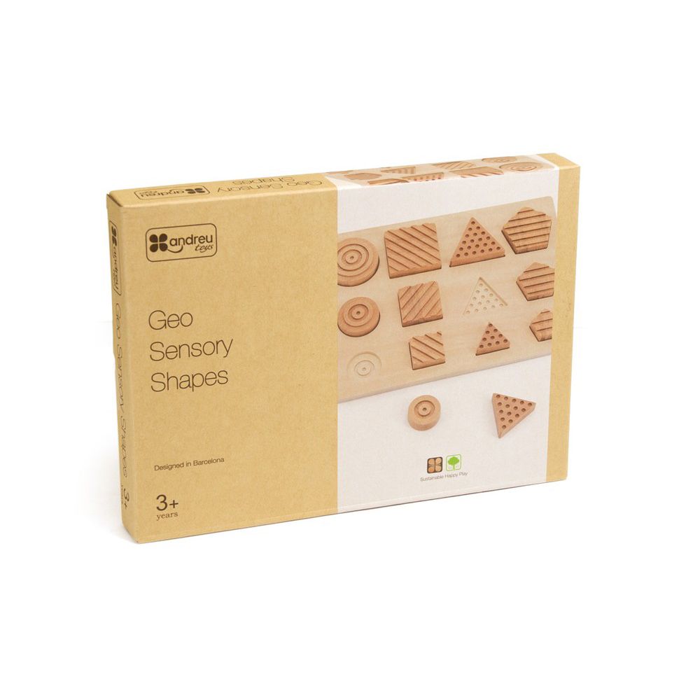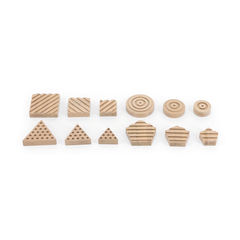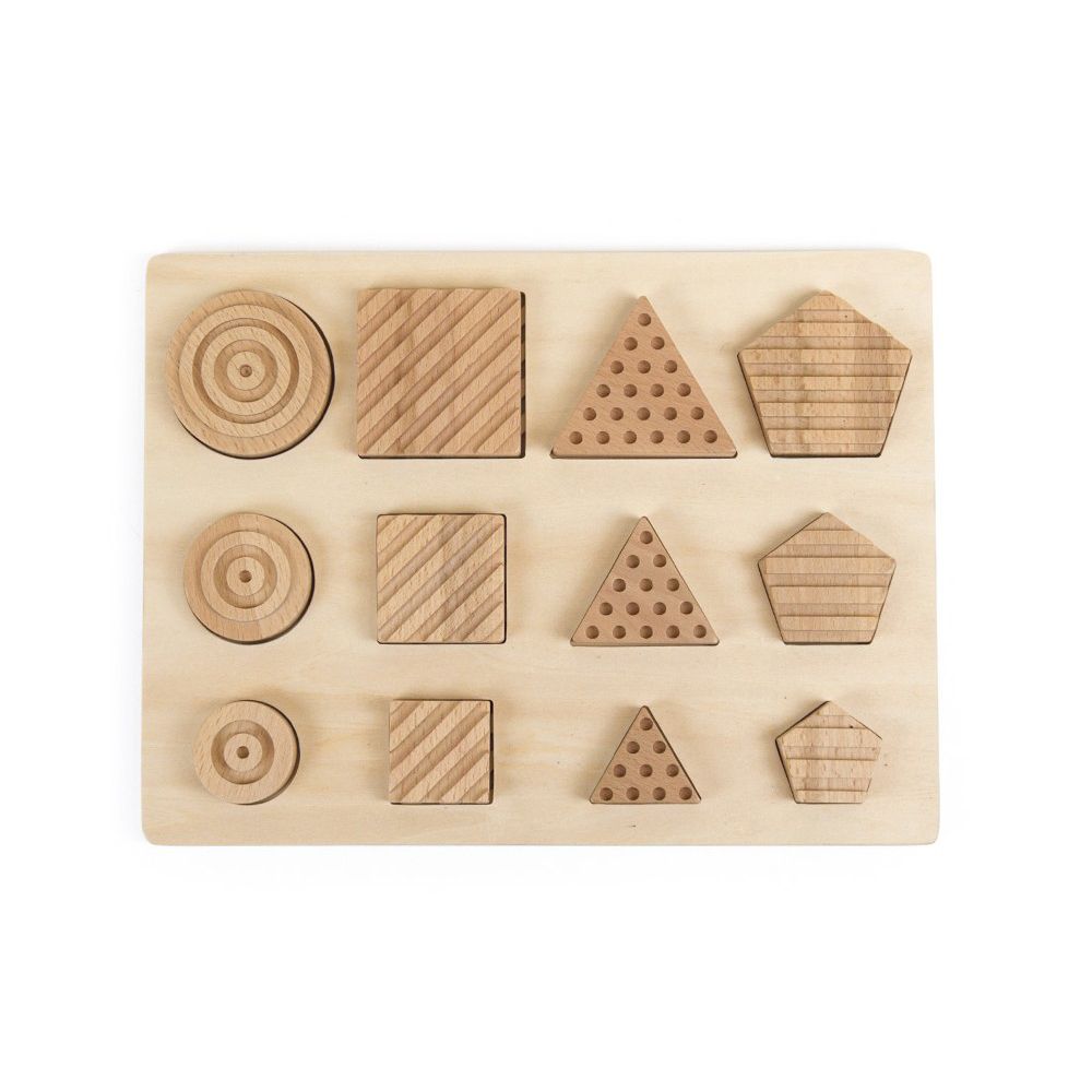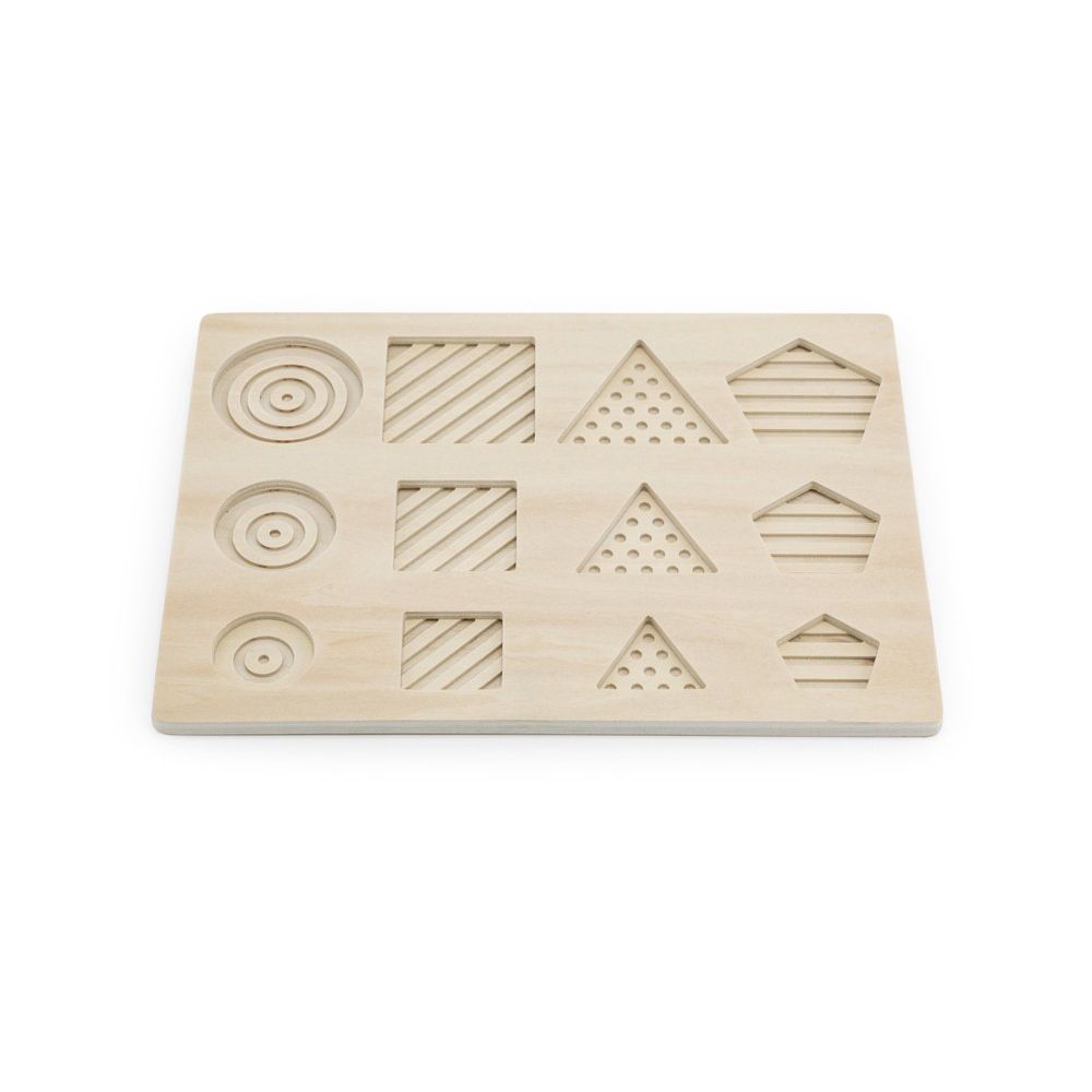 Дървен пъзел изработен от натурално дърво, с който децата ще могат да научат различни форми и размери. Пъзелът съдържа 12 сензорни парчета – 4 геометрични фигури, 4 различни гравюри и 3 размера. Изостря сензорното развитие и класификацията на различните парчета, в зависимост от техния размер, геометрична форма или релефа му. Страхотна образователна игра за развиване на тактилно разпознаване.