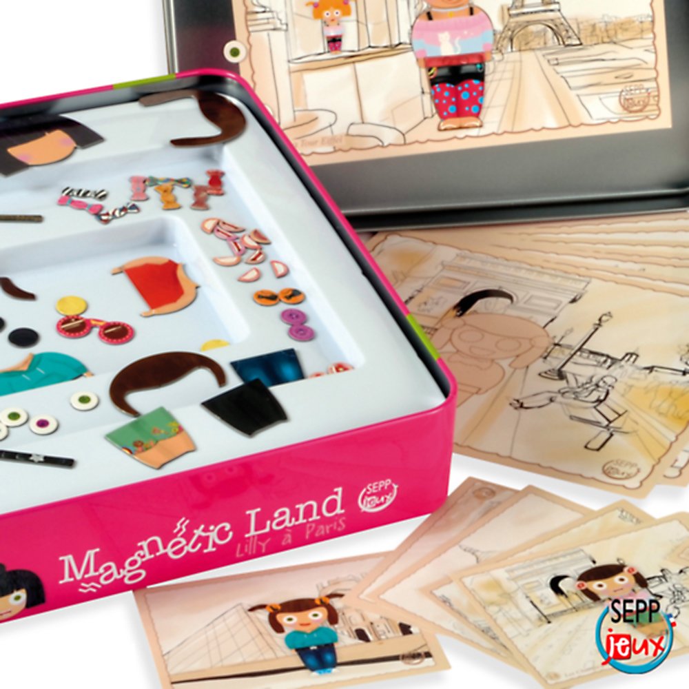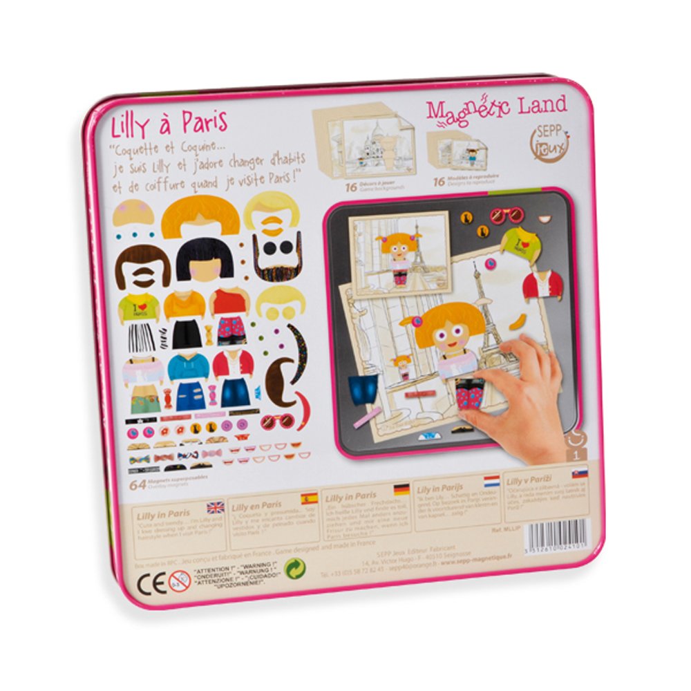 Аз съм Лили и обожавам да обличам нови дрехи и да променям прическата си, когато посещавам Париж. С този комплект ще създадете много и различни комбинации на дрехи и аксесоари на Лили. Магнитите са лесни за подреждане и могат да се слагат един върху друг. Комплектът съдържа 1 метална кутия с размери 27 x 27 x 6 см с места за поставяне на магнитите и листата с образците, 64 цветни магнита, 8 цветни двустранни страници с размер 21 x 17 см (8 изгледа от Париж и 8 изгледа от Париж заедно с Лили), 8 карти с размер 10,5 x 8,5 мм, цветно отпечатани от двете страни (16 модела на Лили).