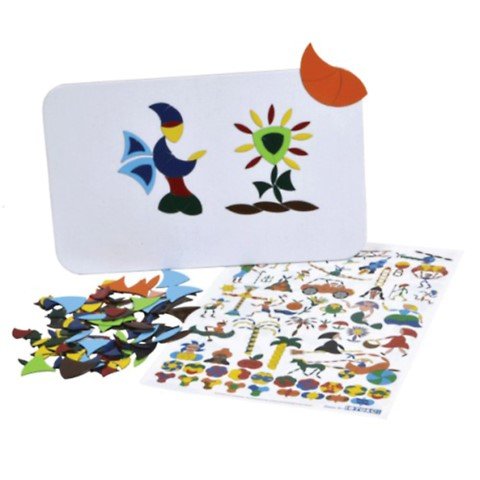 Забавна детска игра/мозайка с 120 магнитни части в 8 различни цветове. Мозайката съдържа 2 страници с цветни идеи, 1 магнитна дъска с размер 290 x 180 мм, 80 меки магнита с различни форми в 4 цвята с размер 20 мм и 40 меки магнита в