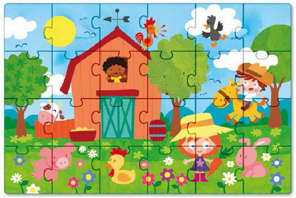 Детски образователен пъзел, съдържащ 24 ламинирани елемента с размер 7 х 7 см, с които децата ще могат да си наредят красива картина изобразяваща живота във фермата. Спомага и за научаването на нови думички. Подходящ е за игра и в детски градини и занимателни центрове.