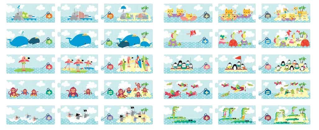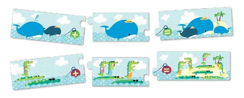 Това е един изключително интересен и образователен пъзел/игра за децата. Той има за цел да научи децата да смятат с помощта на любимите им животни – слончета, маймунки, пингвини, крокодили, делфини и много други. С 30-те ламинирани елемента с размери 16 х 7 см, децата ще могат да съставят и решават уравнения. колко костенурки ще играят с хвърчила ако на острова има 2 и към тях се присъединят още 6? Колко делфини има в морето ако първоначално има 1 и поле се покажат още 2? Какъв по интересен начин за малките дечица да се научат да смятат? Пъзелът е много подходящ и за игра в детски градини.
