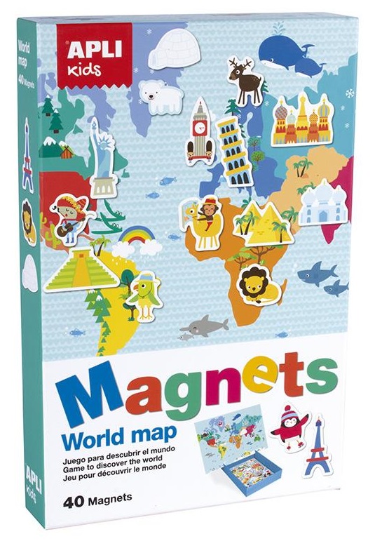 Играта насърчава концентрацията, вниманието и наблюдателността на децата. Комплектът съдържа: 1 магнитна карта на света с размери 36 х 28 см, картонена кутия с прорези, която служи за поставяне на картата и 40 магнитни картони.
