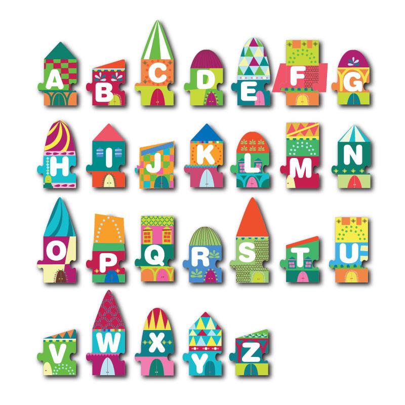 Детски пъзел с букви от латинската азбука, с който всяко дете лесно и бързо ще ги научи и постепенно ще започне само да изписва различни думички, като свързва частите на пъзела. Комплектът съдържа 40 елемента с букви с размери 14 х 8 см. Всеки елемент има вид на къща или блок. Елементите се свързват само хоризонтално. Целта е да се направи комбинация от къщи или блокове, които да образуват думи. Пъзелът е подходящ за научаване на чужди езици или просто за забавление. Подходящ е за игра в детски градини и училища.