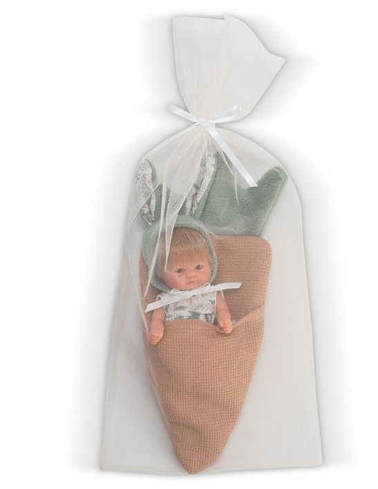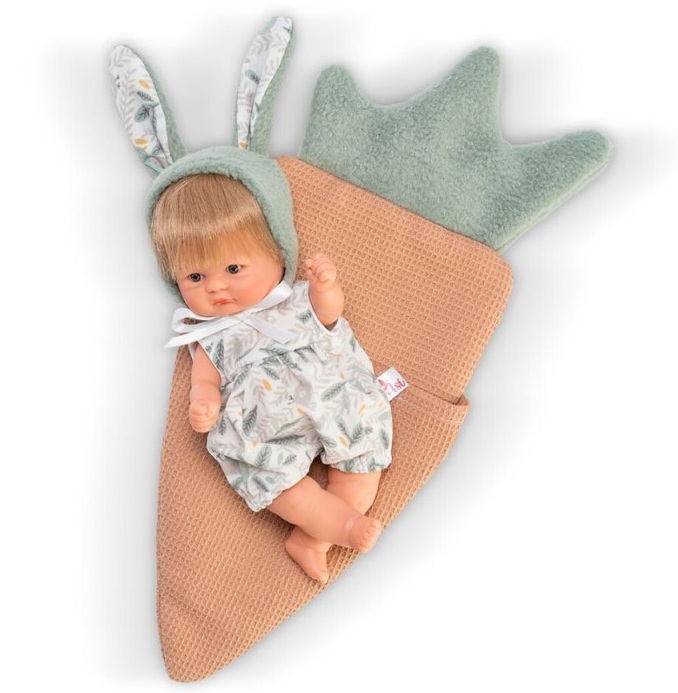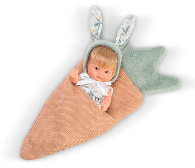 Куклата е придружена с меко спално чувалче във формата на морков.