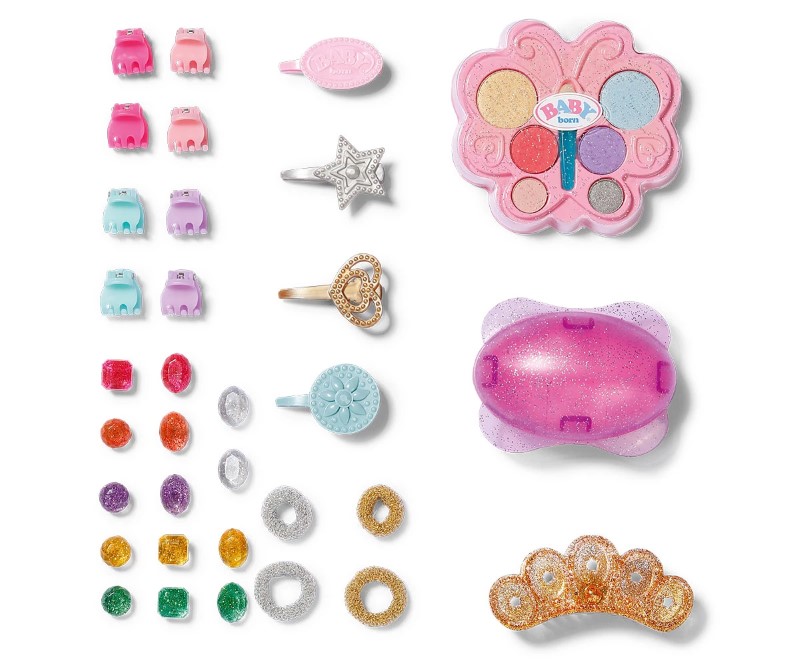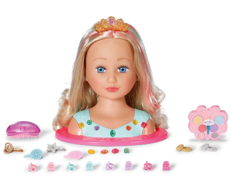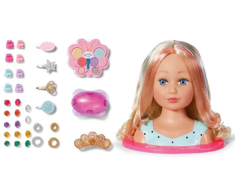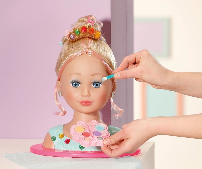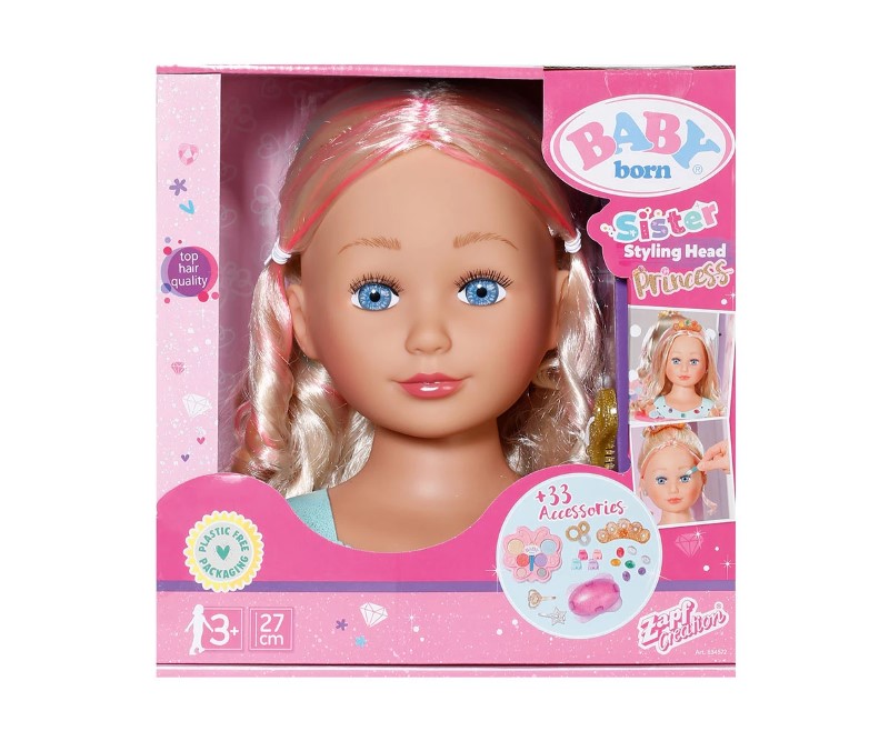 BABY born Sister Styling Head Princess е в комплект с палитра гримове, четка за коса, фиби, диадема и други.