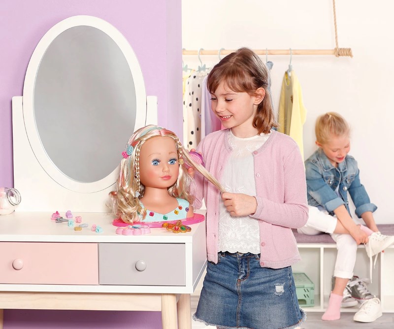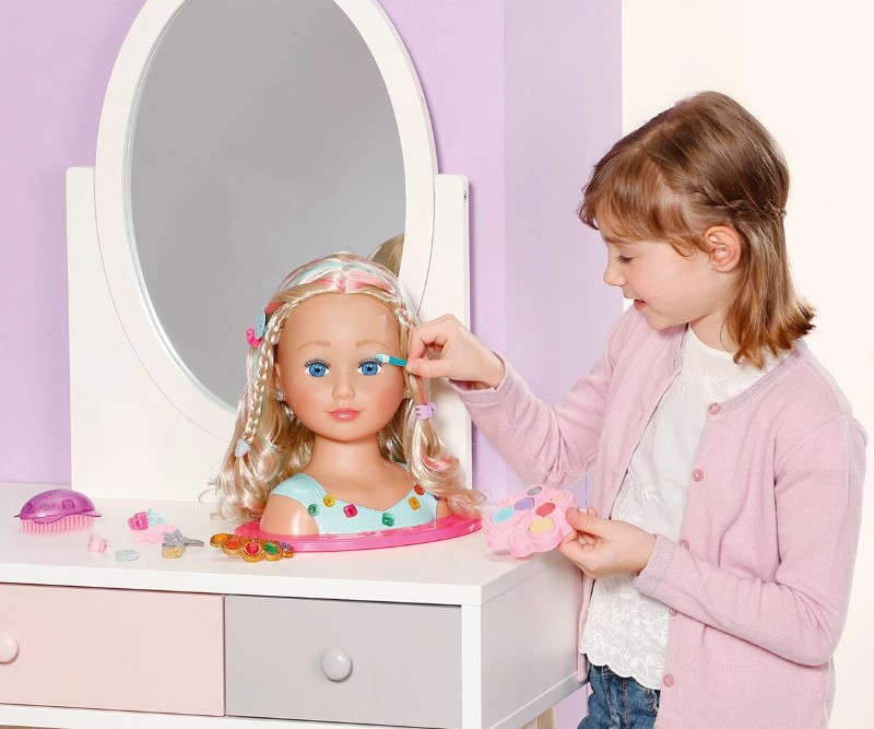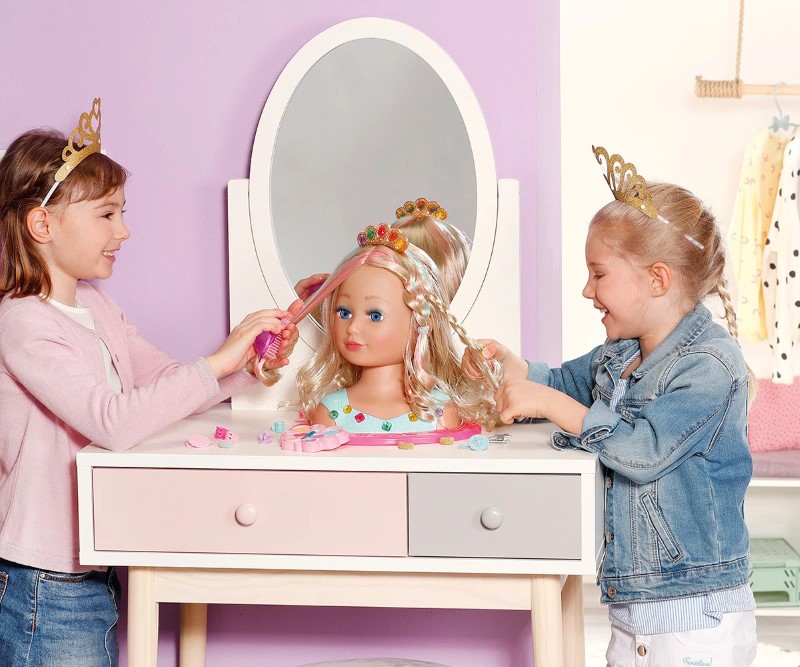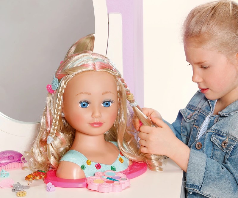 Младите гримьори вече могат да създават зашеметяващи визии с цветната палитра гримове, а бъдещите стилисти ще могат да правят красиви прически върху дългата руса коса с помощта на включените в комплекта аксесоари за коса. Независимо дали става въпрос за леки къдрици, елегантни прически, плитки или конски опашки – малките стилисти могат да развихрят въображението си.