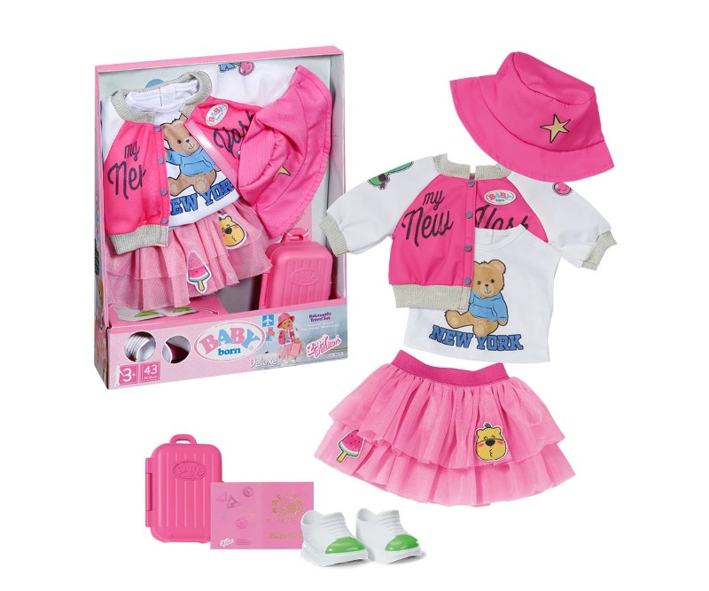 Комплект с дрешки за пътуване от Baby Born Deluxe Travel, включващ якенце, тениска, пола от тюл, обувки, шапка и куфар за дрехи. Не забравяйте да вземете и паспорта на куклата си, тъй като ще ви е необходим, преди да излетите на почивка.