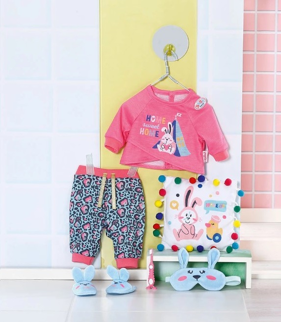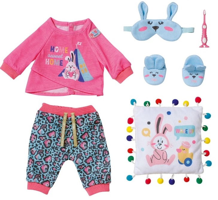 Комплектът включва: Пижамка с блузка и панталонки, чехли, маска за сън, възглавница и четка за зъби. Дрешките са предназначени за кукли с височина 43 см.