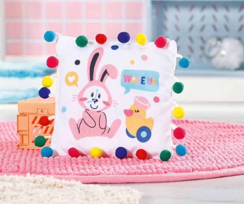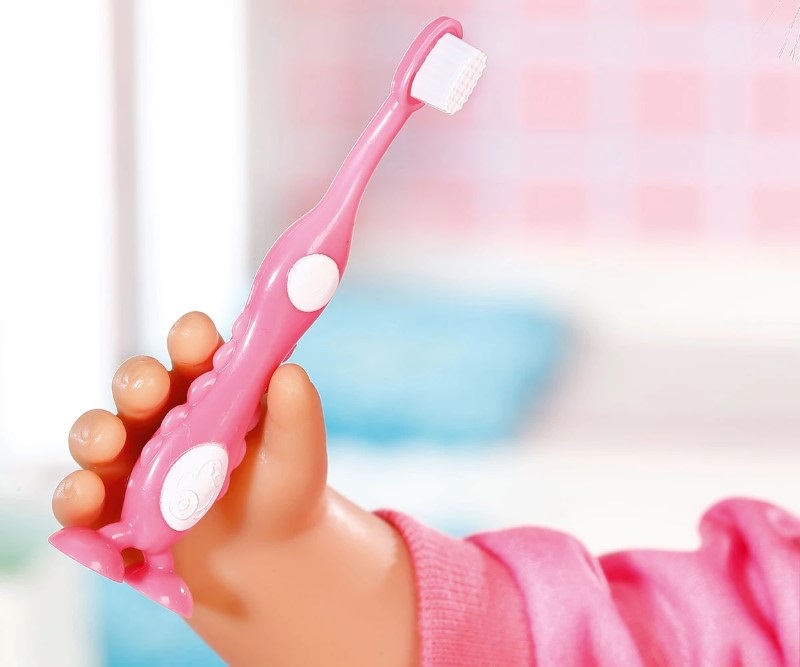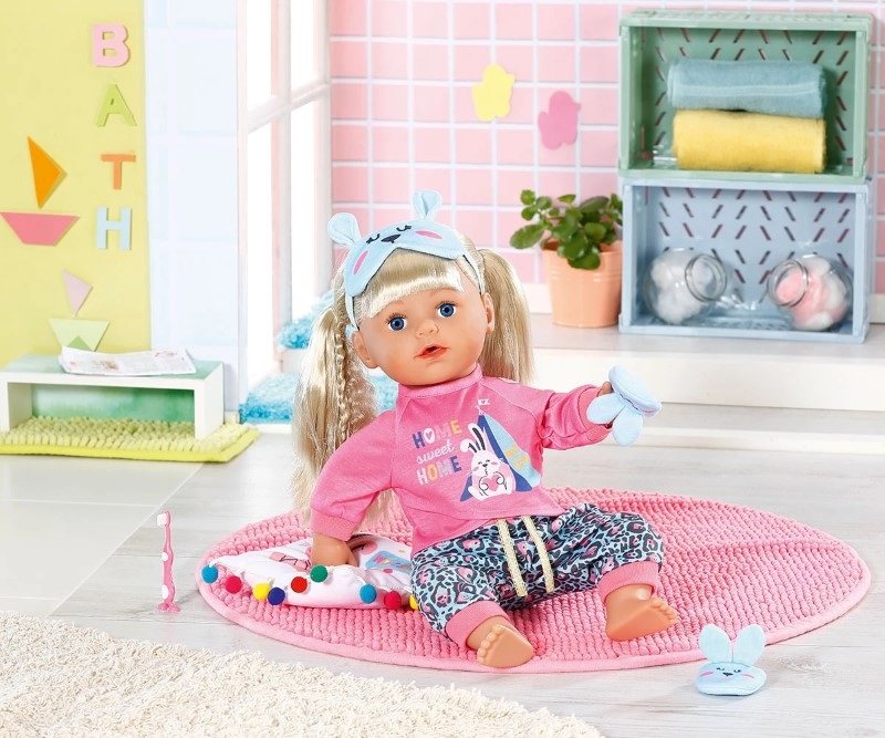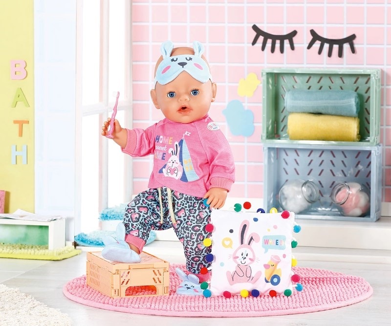 Измийте й зъбите с розовата четка за зъби и след това облечете пижамата й, която е с изображение на зайчето Бено. Нейните меки чехли и синя маска за сън са в същата тематика на зайче с уши. Baby Born вече е готова да се настани удобно на възглавницата с цветни топчета. Лека нощ!