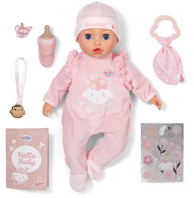 Анабел идва с всичко необходимо за грижовна игра: шише, биберон, мека кърпичка, гердан, бебешки паспорт и лист със стикери, както и сладък тоалет – гащеризон и шапка. Това е пълен стартов комплект за игра с кукли.