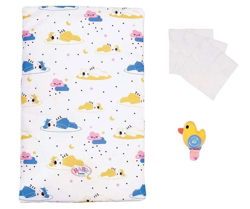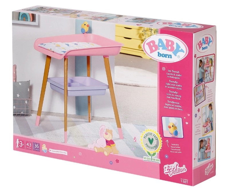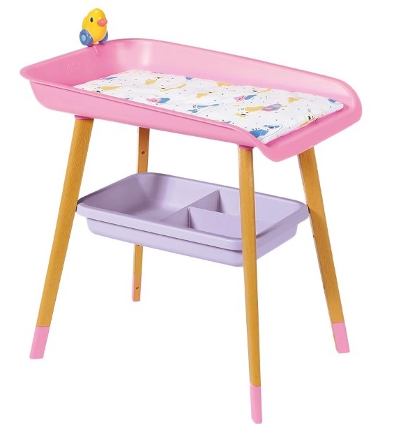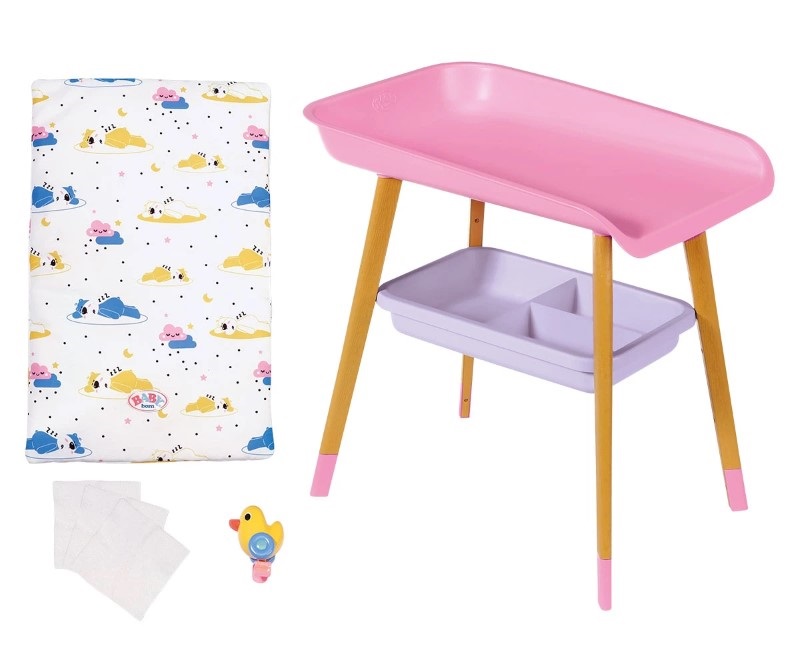 Масата за преобличане на кукли е проектиране в скандинавски дизайн и има крака с дървен вид. В комплекта е включена мека подложка за преобличане на куклата, малка играчка за кукли във формата на патица и 3 малки кърпички за почистване на куклата. Има и отделение от 3 части под постелката за преобличане, в която можете да съхранявате нови пелени, дрехи, играчки или други аксесоари за куклата.