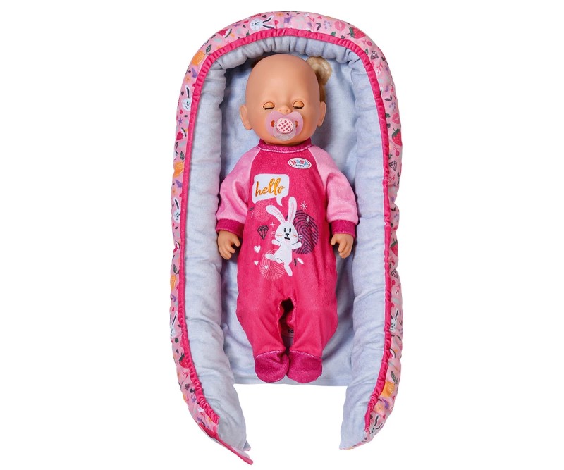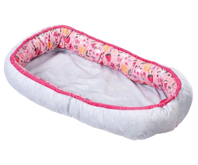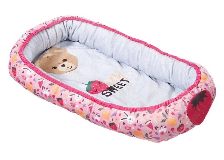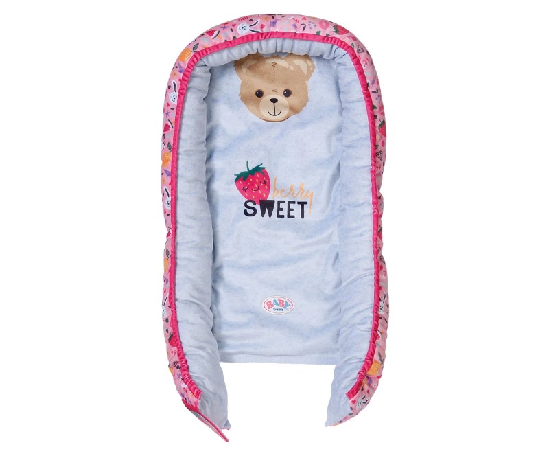 Меко гнездо за кукли, в което можете да поставите вашето бебе Baby Born на сигурно място, близо до вас. Гнездото е с цветен дизайн на горски плодове и мече, затварящо се в долната част с помощта на велкро лепенка.