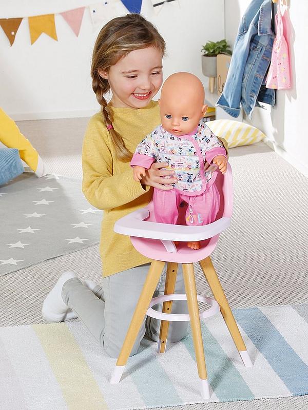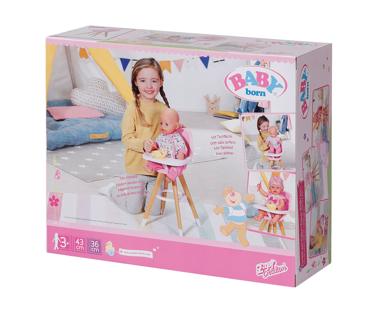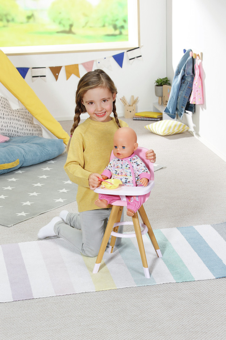 Детско столче, в което вашата малка принцеса ще може да храни своето бебе. Столът е с красив дизайн е с дървени крака и удобна розова седалка. На облегалката, мечката Бруно и патицата Берта вече очакват развълнувано обяда си. Светлорозовата маса разполага с достатъчно място за чинията и бутилката на BABY born. И разбира се, масата не е само за хранене: тя е идеална и за рисуване, занаяти и игра с градивни елементи. Подходящ е за кукли до 43 см.