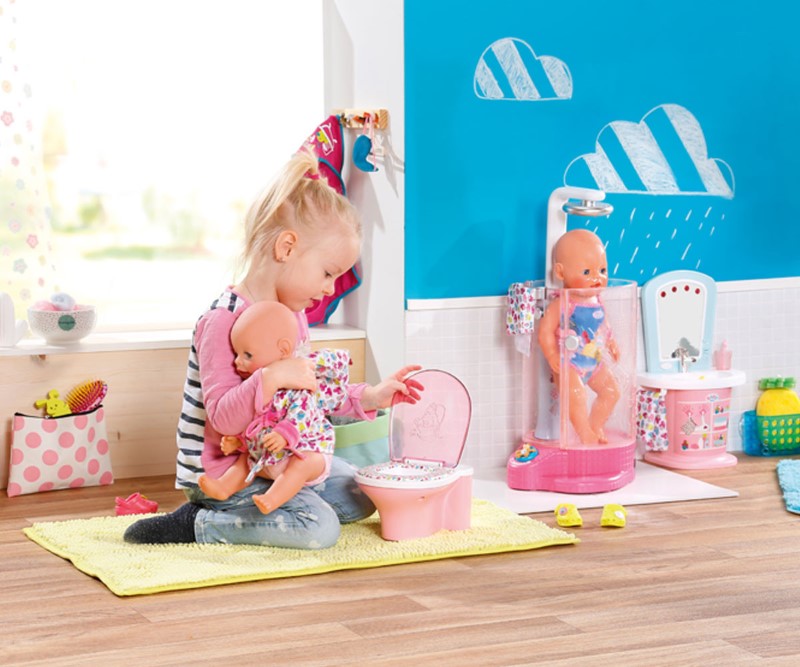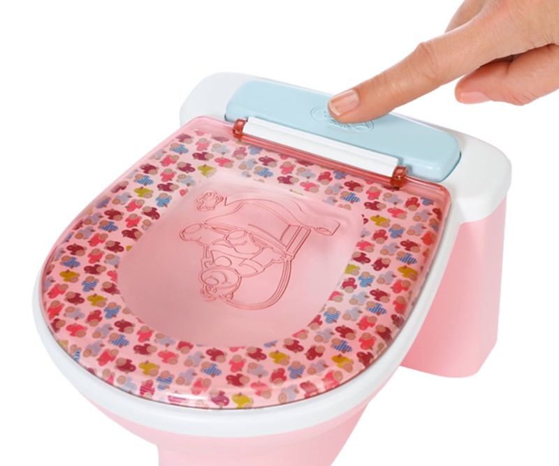 Ученето на гърне може да бъде толкова забавно с новата тоалетна на Baby Born. Тоалетната за кукли е с цветна печатна седалка, която привлича вниманието. На капака Бруно мечката показва на малката принцеса как работи. Докато куклата седи на тоалетната, звучи мелодия и тя ще получи аплодисменти, когато свърши работата си.