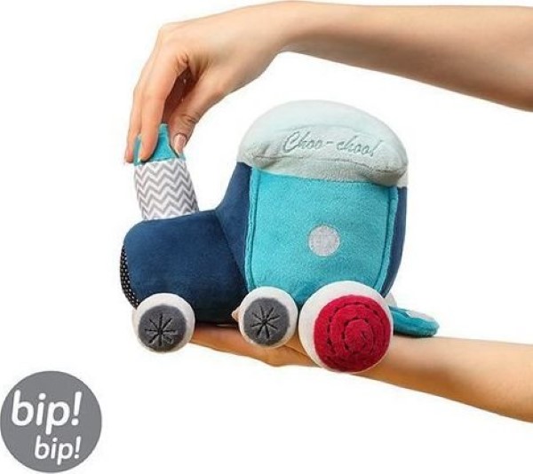 Комплектът образователни играчки Сафари влакче се състои от локомотив с два вагона, като към тях са прикрепени скърцащи, тракащи и шумолещи играчки.