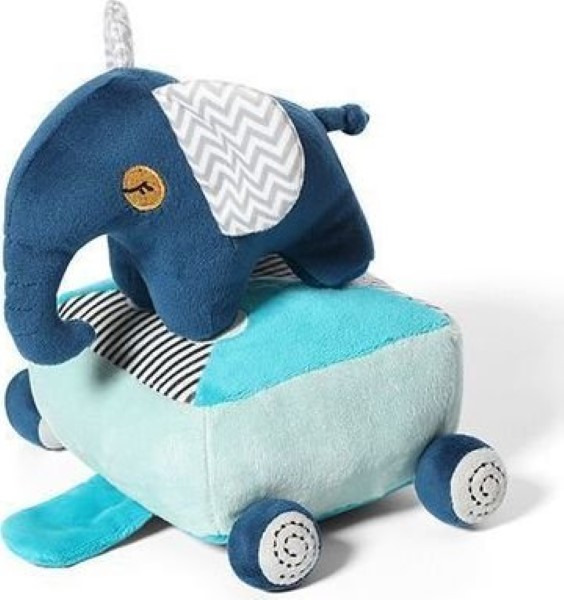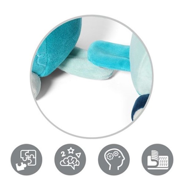 Играчката има няколко части, които могат да бъдат подредени по различни начини с помощта на велкро. Това ще предизвика интереса на детето, ще фокусира вниманието му и ще го учи на пространствено мислене. Множество текстури, които ще насърчават бебето да стиска и да играе с играчката, развивайки сетивността си и фината си моторика. Шумолящите елементи, поставени в ушите на слончето ще заинтересуват детето и ще привлекат вниманието му, а меката силиконова гризалка, включена в играчката, успокоява раздразнените венци по време на никнене на зъбки.
