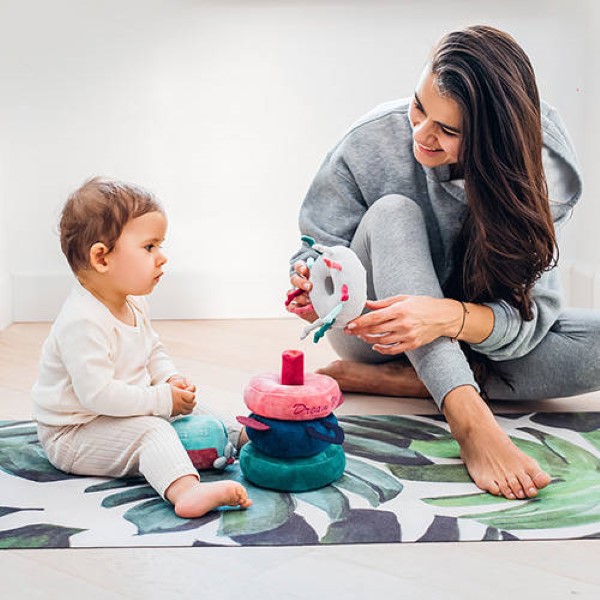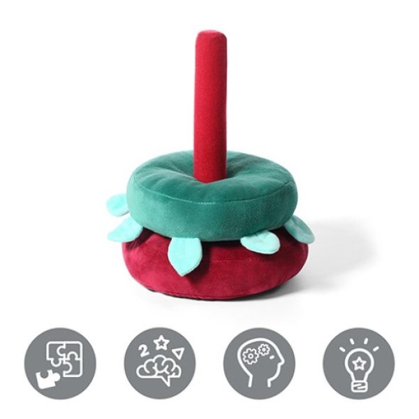 Благодарение на универсалните отвори и възможността за подреждане на елементите във формата на кула, ще стимулира сетивата зрението, допира и слуха на детето, а топлите и пастелни цветове ще развиват зрението, въображението и способността за концентрация.