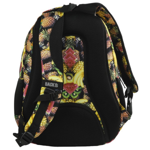 Просторна и функционална училищна раница, която ще се хареса на всеки. Раницата се характеризира с качествена изработка и интересни мотиви с тропически плодове. Материалът, от които е изработена раницата е водоустойчив и издръжлив. Раницата е просторна и разполага с 3 отделения: * първото отделение е удобно за поставяне на лаптоп или таблет, * второто отделение е предназначено за учебници и тетрадки с формат А4 и има удобен органайзер с карабинер за ключове, * трето отделение – за по дребни вещи. От двете страни раницата има два отворени мрежести джоба за бутилки с вода. Задната част (гърба) на раницата е ергономично оформена и е покрита с дишащ плат. Презрамките са широки, подплатени и регулируеми. Дъното е подсилено. В горната част на раницата има подплатена дръжка за носене. Раницата може да се почиства ръчно при 30 градуса. Може да се комбинира с чанта, несесер или спортен сак от тази или друга серия.