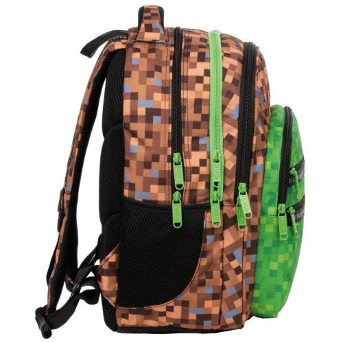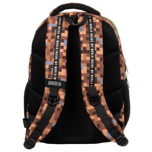 Всяко дете ще хареса тази функционална и удобна ученическа раница с качествена изработка и страхотен модерен дизайн в стила на minecraft. Материалът, от който е ушита е водоустойчив и издръжлив. Раницата е просторна и разполага с 4 отделения и два предни джоба. В една от камерите има голям разделител за лаптоп или таблет; второто отделение е предназначено за учебници и тетрадки с формат А4 и има малък джоб с цип; третото отделение има удобен органайзер с карабинер за ключове; четвъртото отделение е за по-дребни аксесоари. В предната си част има и два допълнителни джоба за ученически пособия, както и отстрани са разположени два мрежести джоба за бутилка с вода. Гърбът на раницата е добре подплатен и е покрит с дишаща материя със системата Air Flow. Презрамките са широки, меко подплатени и регулируеми. Дъното е подсилено с пяна. Дискретните отразители ще гарантират безопасност на пътя. Препоръчителна за деца от 2 до 5 клас.