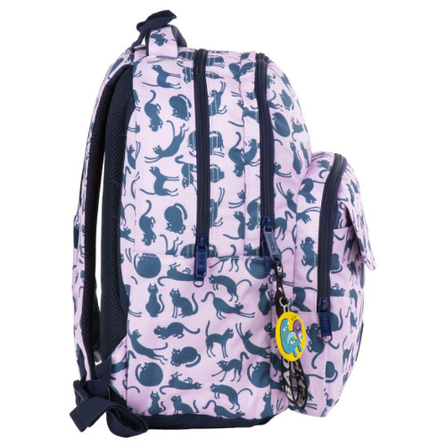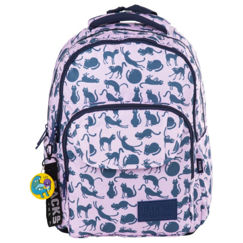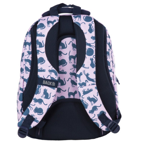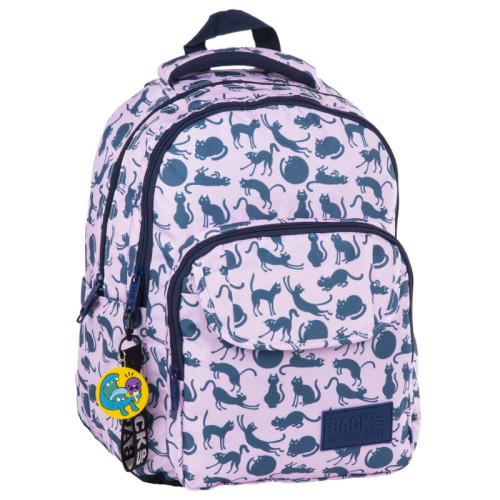 Раницата е изработена от водоустойчив и издръжлив плат и разполага с 2 големи отделения, 2 предни джоба и 2 странични джоба за бутилки. В първото отделение има разделител за лаптоп или таблет, а второто е подходящо за учебници и тетрадки с формат А4 и има малък джоб с цип. Раницата разполага и с удобен органайзер за съхраняване на дребни вещи. Гърбът на раницата е ергономично оформен и покрит с дишащ материал. Презрамките са широки, регулируеми, дъното е подсилено и има дръжка, удобна за носене в ръка. Раницата е и със светло-отразителни ленти, които осигуряват допълнителна безопасност на пътя.