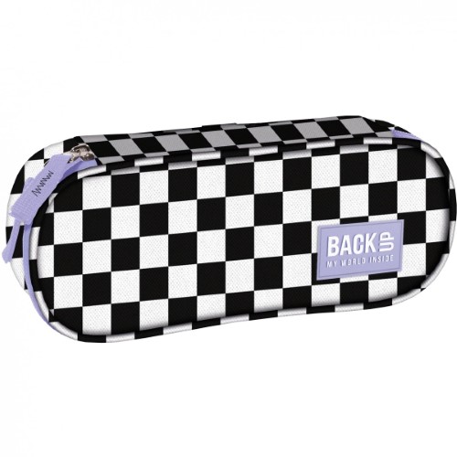Овален несесер за ученически пособия, затварящ се с двупосочен цип от серията Colored Chess 6 A 94F на BackUp, който със своя сладък десен на класическо черно-бяло каре с лилави ципове, който ще се хареса на всяка малка дама.