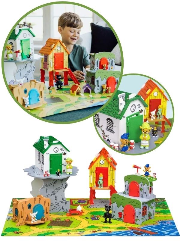 Удобните за игра къщички са изработени от дърво и лесно се разглобяват и сглобяват. Те пасват идеално на хубавата картонена дъска за игра, която представлява град с пътища, къщички, дървета, градинка с моркови и малко езеро с мост.