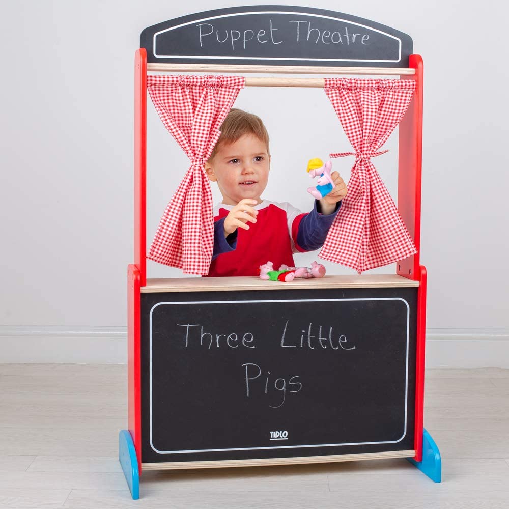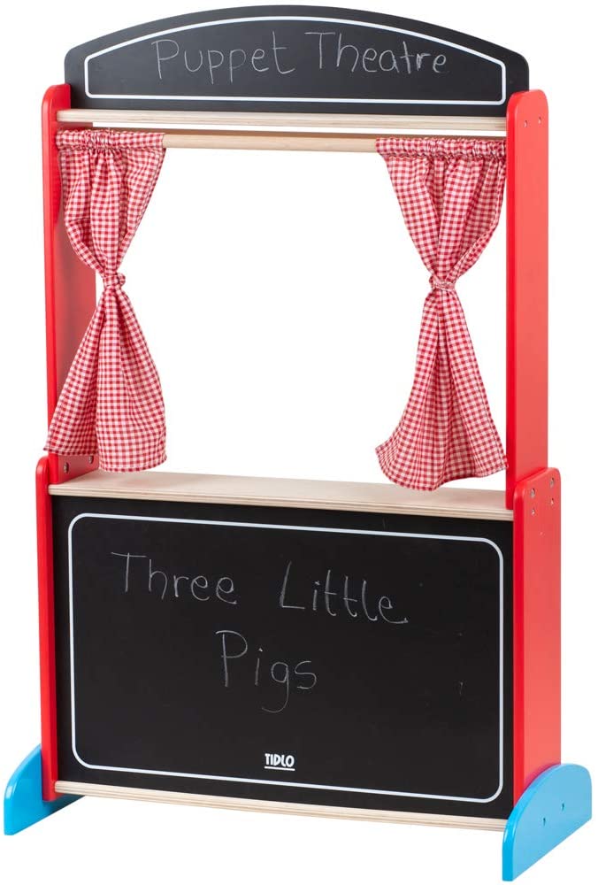 Този класически куклен театър е готов да помогне на децата да представят своите страхотни представления. Коя постановка ще се изпълнява днес? Напишете я на черната дъска, за да запознаете публиката с днешното шоу. Театърът разполага с червени завеси, които могат да се спускат, така че да откриват и закриват представлението. Театърът има достатъчно място отзад, така че децата могат да седят зад кулисите, докато ръководят шоуто. Куклената игра е чудесен начин да вдъхновите творческата и въображаемата игра на децата, които същевременно ще изградят и увереност. Децата ще разказват истории, упражнявайки своя речник и ще могат да изразяват различи емоции. Развива се координацията между очите и ръцете, фината моторика и сръчността. Изисква се сглобяване от възрастен.