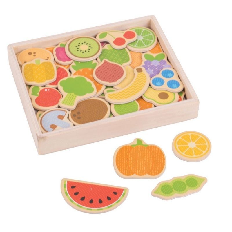 Този комплект съдържа 35 ярко оцветени магнитни включващи разнообразие от плодове и зеленчуци – пъпеш, череши, ананас, праз, броколи, лук, гъби, грозде и много други. Всяко дървено парче има магнитен гръб, което позволява на децата да ги поставят върху магнитна дъска или хладилник. Чудесен начин, децата да се запознаят с различните здравословни продукти и как приготвяме храната си с тях. Комплектът се предлага в здрава дървена кутия за съхранение. Подпомага за развитието на сръчността и концентрацията. Изработен е от висококачествени материали, съответстващи на действащите европейски стандарти за безопасност.