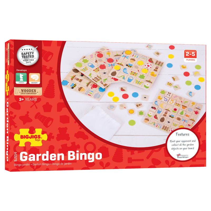 Забавлявайте се с приятели или със семейството си с тази игра на бинго! Победете опонентите си, като първи съберете всички елементи с цветни изображения на тема „градина“. В класическата игра на Бинго, един от играчите действа като „повикващ“ и има главна дъска и плочки. Останалите играчи също си имат дъски и набор от цветни плочки. Повикващият избира плочка и ако някои от играчите я има, покрива картинката на основата за игра. Играта продължава, докато един играч има линия, а след това и „фул хаус“. Тази забавна игра в стил бинго предлага много забавления за децата, като същевременно те ще практикуват и своя речник. Чудесен начин за развиване на умения за съвпадение и концентрация. Играе се с 2-5 играчи. Съдържа 146 елемента, като в това число влизат – 5 дъски, плочки и жетони.