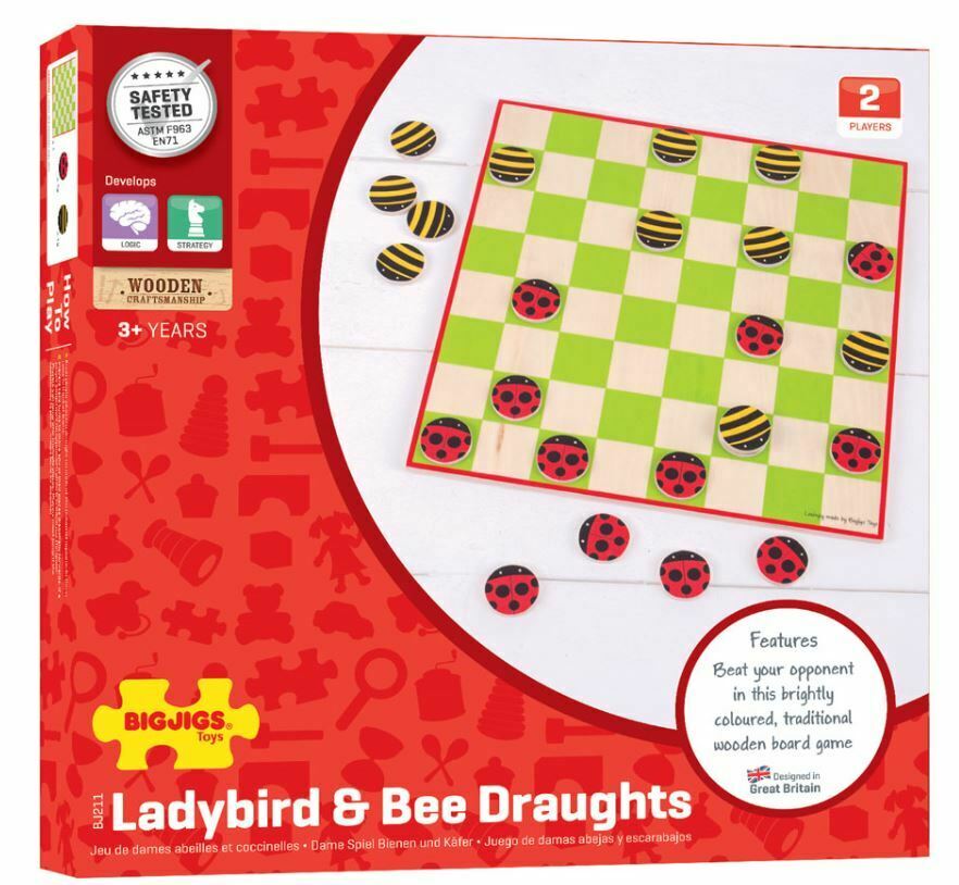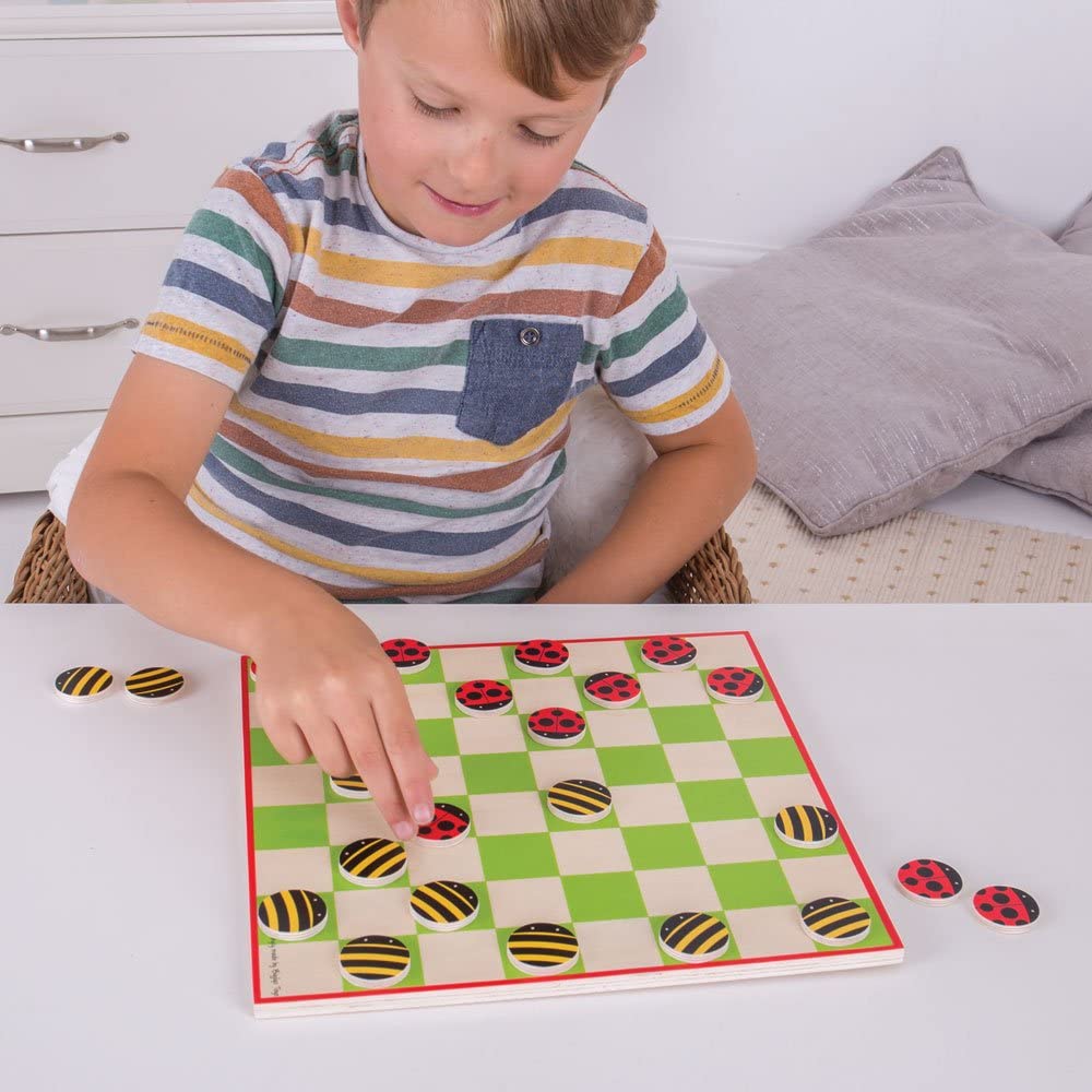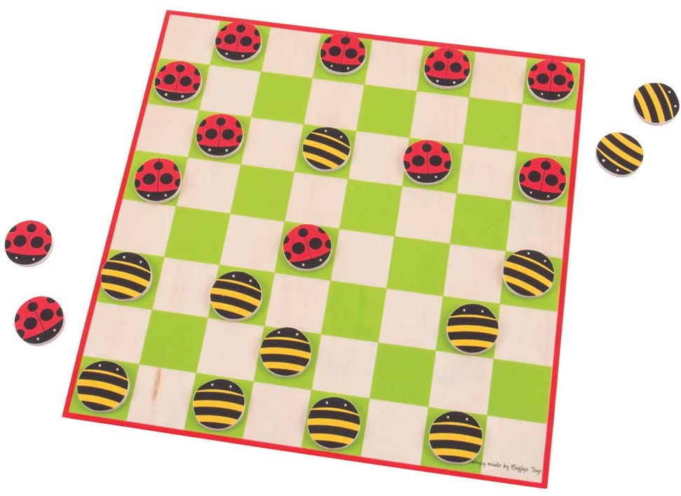 Класическа настолна игра на дама с забавни цветни пулове на пчели и калинки, които са перфектно оразмерени за малките ръце. Изберете си фигурки и играта може да започне. Тази интерактивна игра е с класически правила и е чудесен начин децата да тренират стратегическото и логическото си мислене. Играйте с родители или приятели и се забавлявайте, дори и когато сте на път. Комплектът съдържа: дървена основа, 12 пула с калинки и 12 пула с пчели. Играе се от двама играчи. Изработена е от висококачествени материали, съответстващи на действащите европейски стандарти за безопасност.