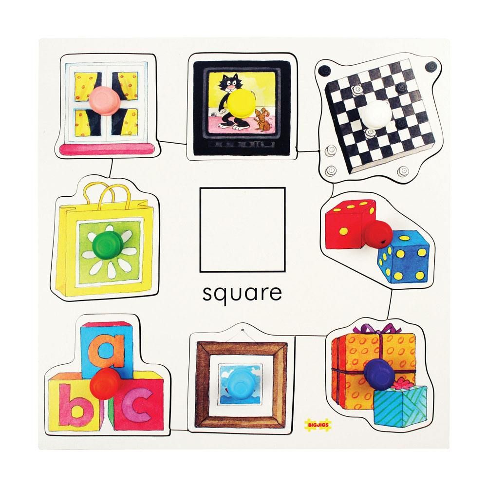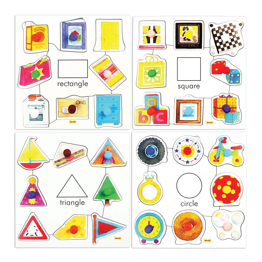 Комплект от 4 пъзела съдържащи различни ежедневни предмети, които могат да бъдат разделени в четири различни форми – кръгове, квадрати, триъгълници и правоъгълници. Сглобяването и поставянето на различните предмети на правилните им места, помага на децата да развият общите си познания. Всяко парче е с прикрепена към него дръжка, което помага на децата лесно да ги хващат и да ги подреждат. Заниманията с тези 4 пъзела спомагат за развитието на сръчността, съвпадението, уменията и концентрацията. Върху дървените дъски са отпечатани различни изображения или цветове, за да подпомогнат процеса на обучението и да добавят образователна стойност. Комплектът съдържа 32 парчета. Пъзелите са подходящи за детски градини и образователни детски центрове.