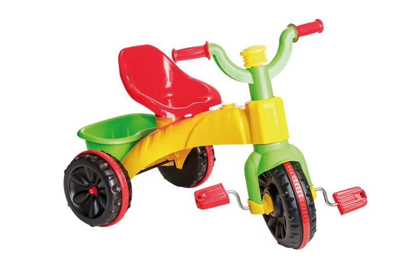 Колелото е с три гуми за по-голяма сигурност, удобна седалка, педали на предното колело и заден кош за багаж или играчки. Истинско удоволствие ще е за децата да го карат навън и в парка.