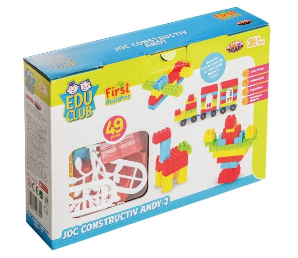 Конструктор с 49 едри елементи, подходящ за игра от по-малки деца. Играта с него помага за развитието на двигателните умения на ръцете, логическото мислене и въображението. С помощта на конструктора детето се научава да прави разлика между цветовете и различните структури и фигури, които прави. Комплекта е подходящ за игра и в детски градини.