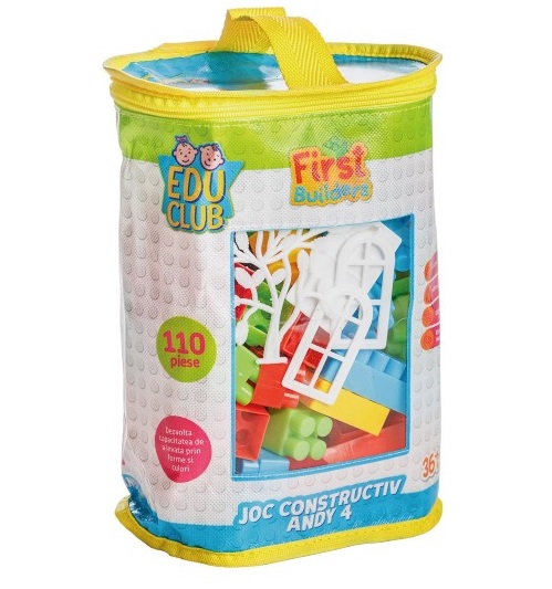 Конструктор с 110 едри елементи, подходящ за игра от по-малки деца. Играта с него помага за развитието на двигателните умения на ръцете, логическото мислене и въображението. С помощта на конструктора детето се научава да прави разлика между цветовете и различните структури и фигури, които прави. Комплекта е подходящ за игра и в детски градини.