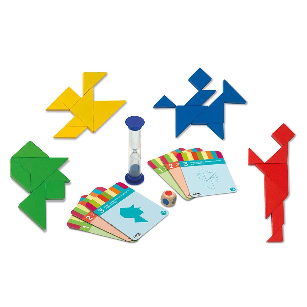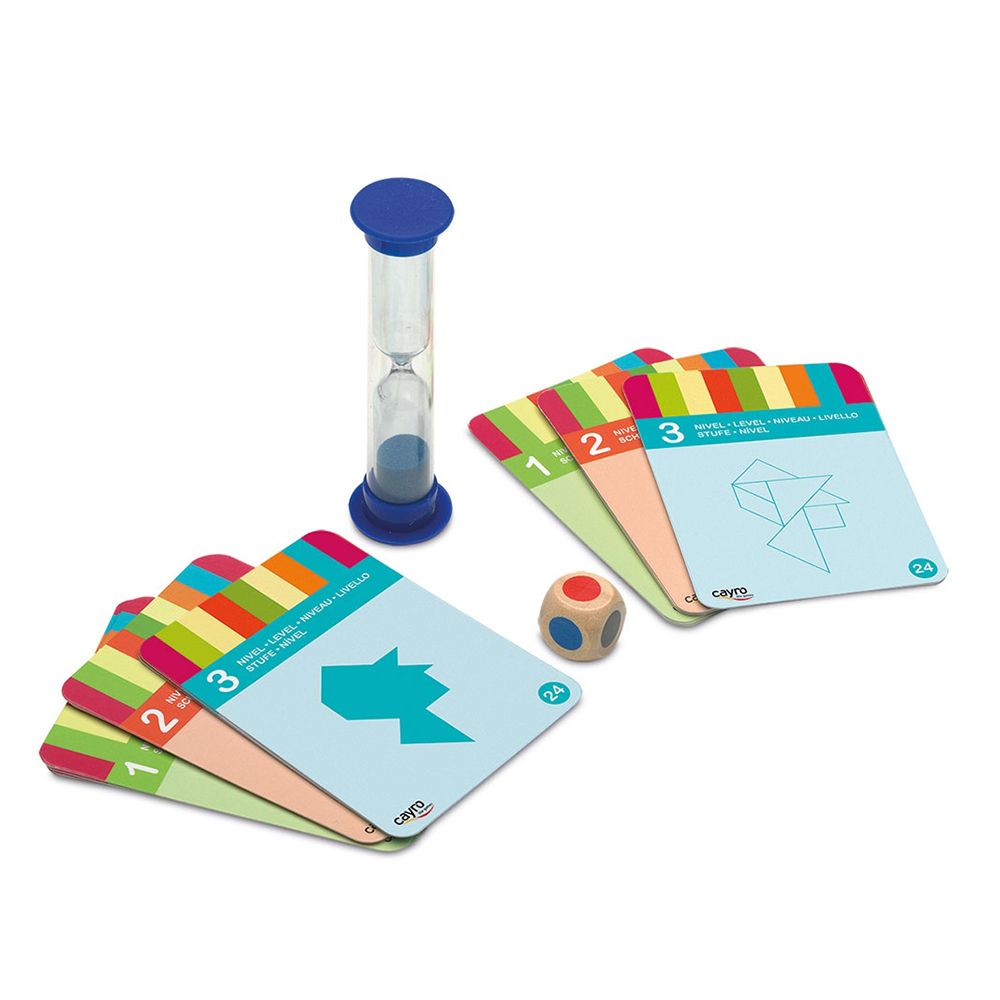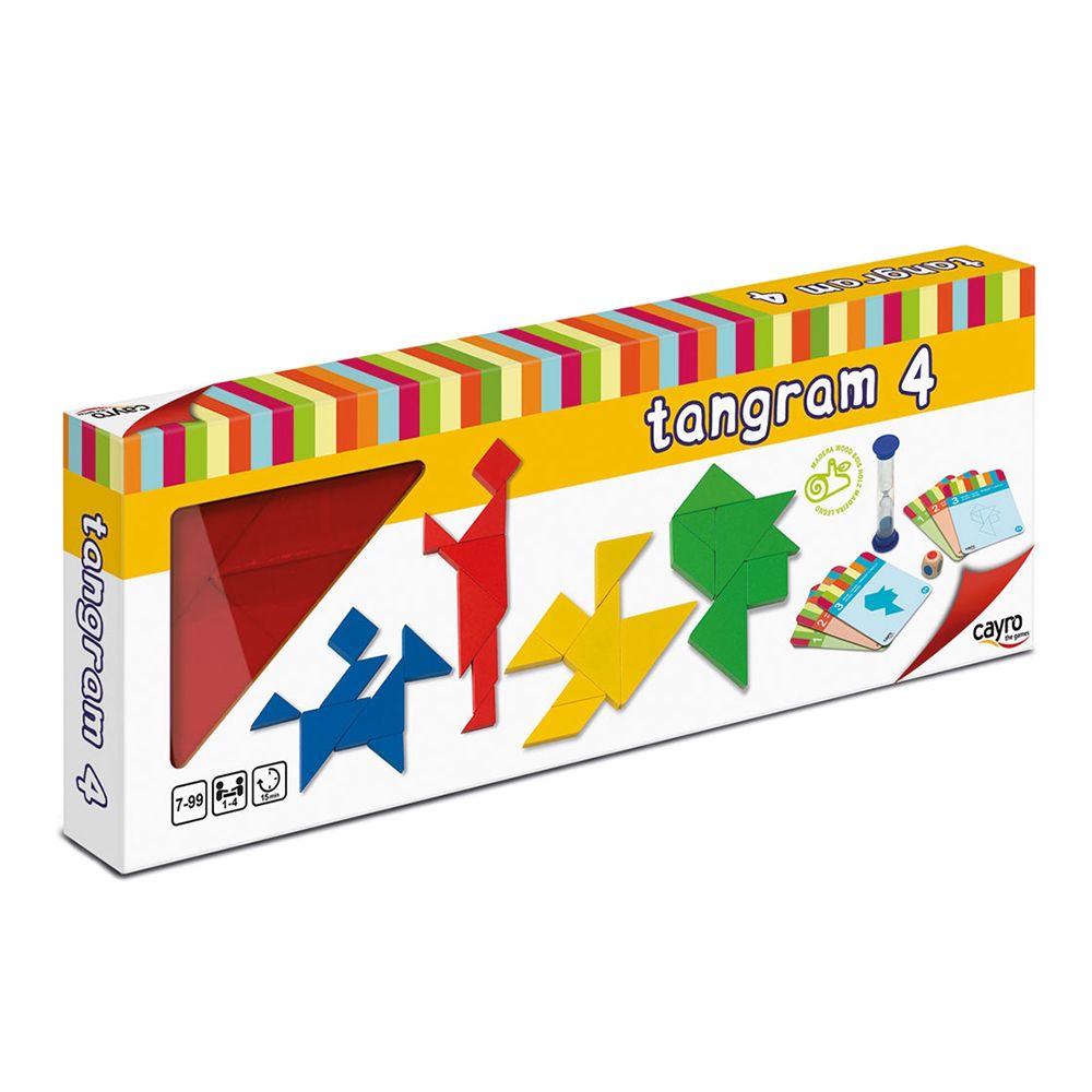 В комплекта ще намерите 4 танграма, всеки в различен цвят, така че могат да играят до четирима играчи. Целта на играта е да решите пръв предизвикателството на Вашата карта.