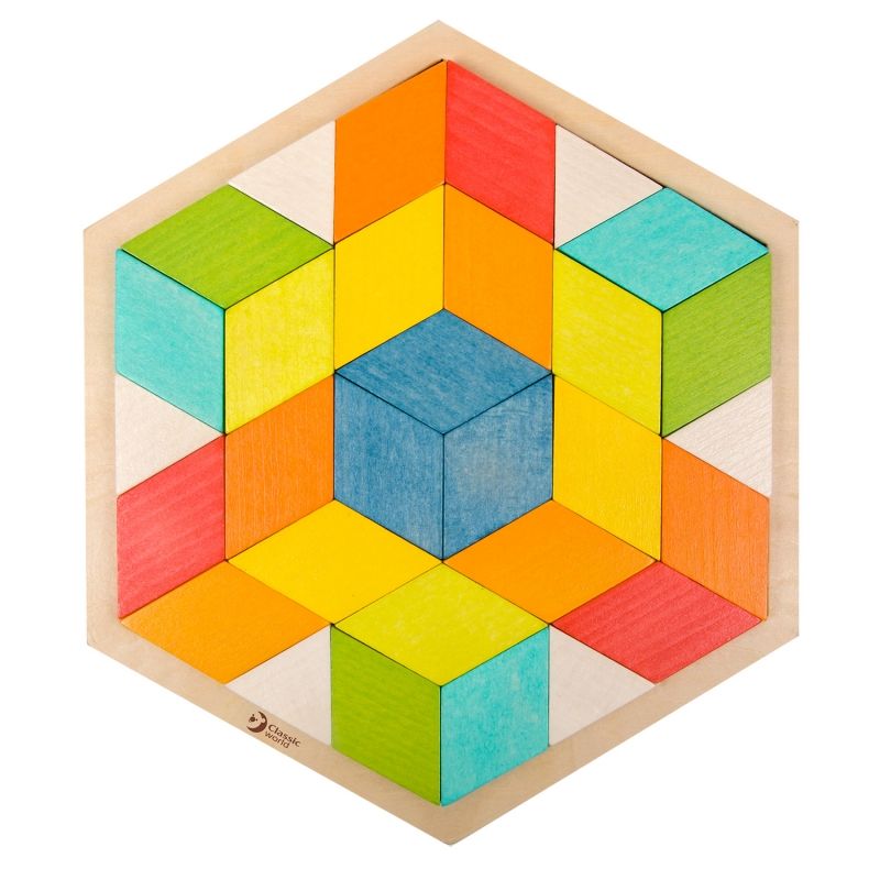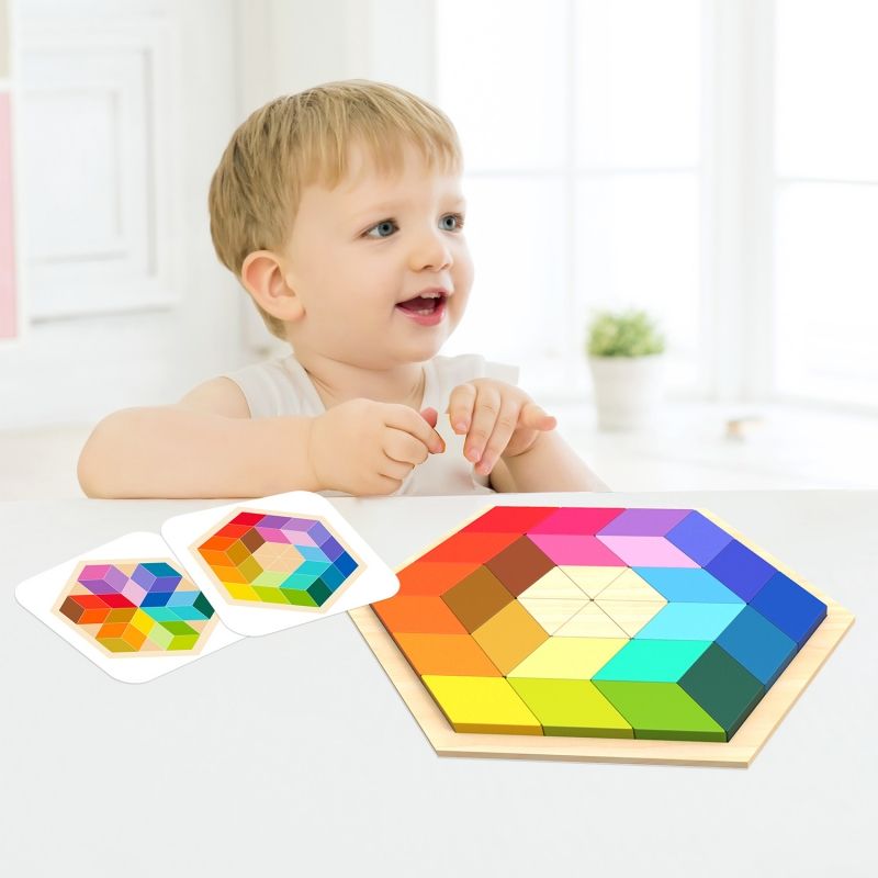Тази дървена мозайка/пъзел ще спомогне за развитието на креативноста и концентрацията на вашето дете. Ромбоидните форми на парчетата позволяват многобройни комбинации за подреждане, както в дървената дъска, така и самостоятелно. Децата могат да експериментират, създавайки различни геометрични форми. Комплектът съдържа и примерни цветни схеми, които ще помогната на начинаещите дечица да се упражняват.