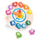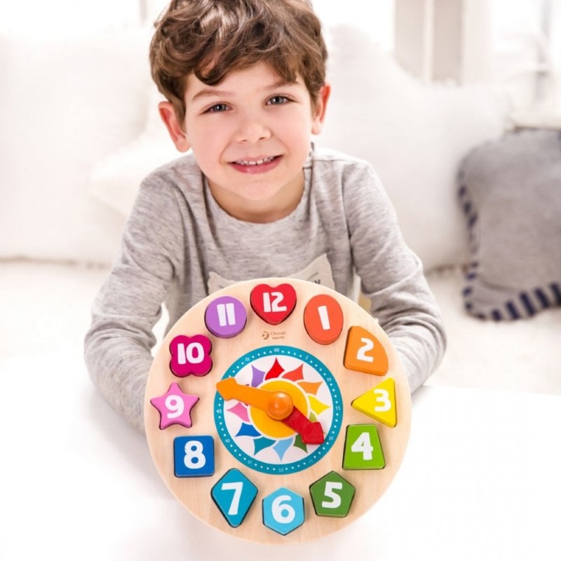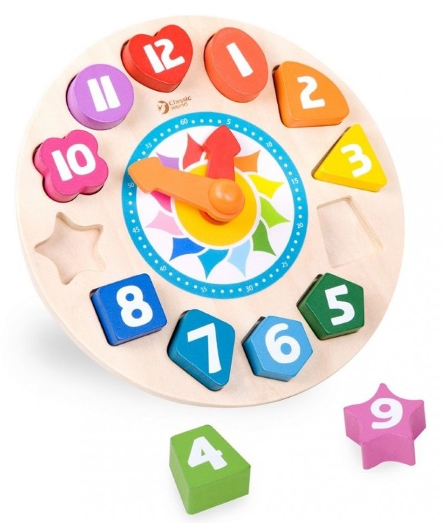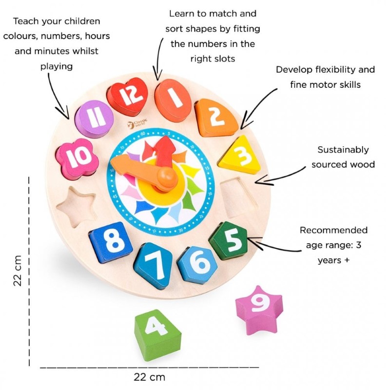Часовете са с различни форми и цветове, което позволява на малките деца да ги сортират и да съпоставят формите на правилното им място. Постепенно ще започнат да местят малката и голямата стрелка, които са фиксирани в средата и да се опитват да разберат колко часа показва часовника.