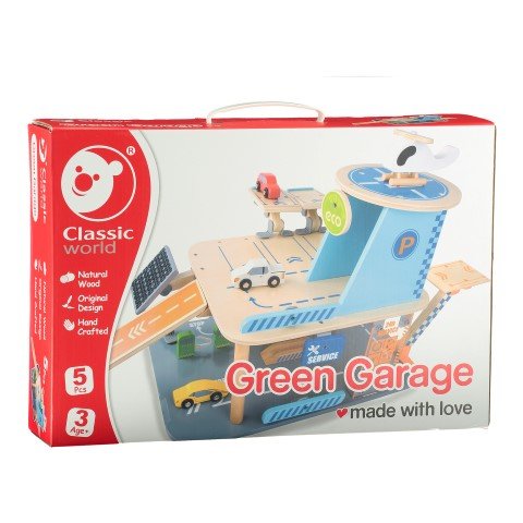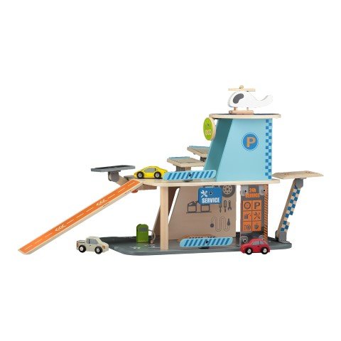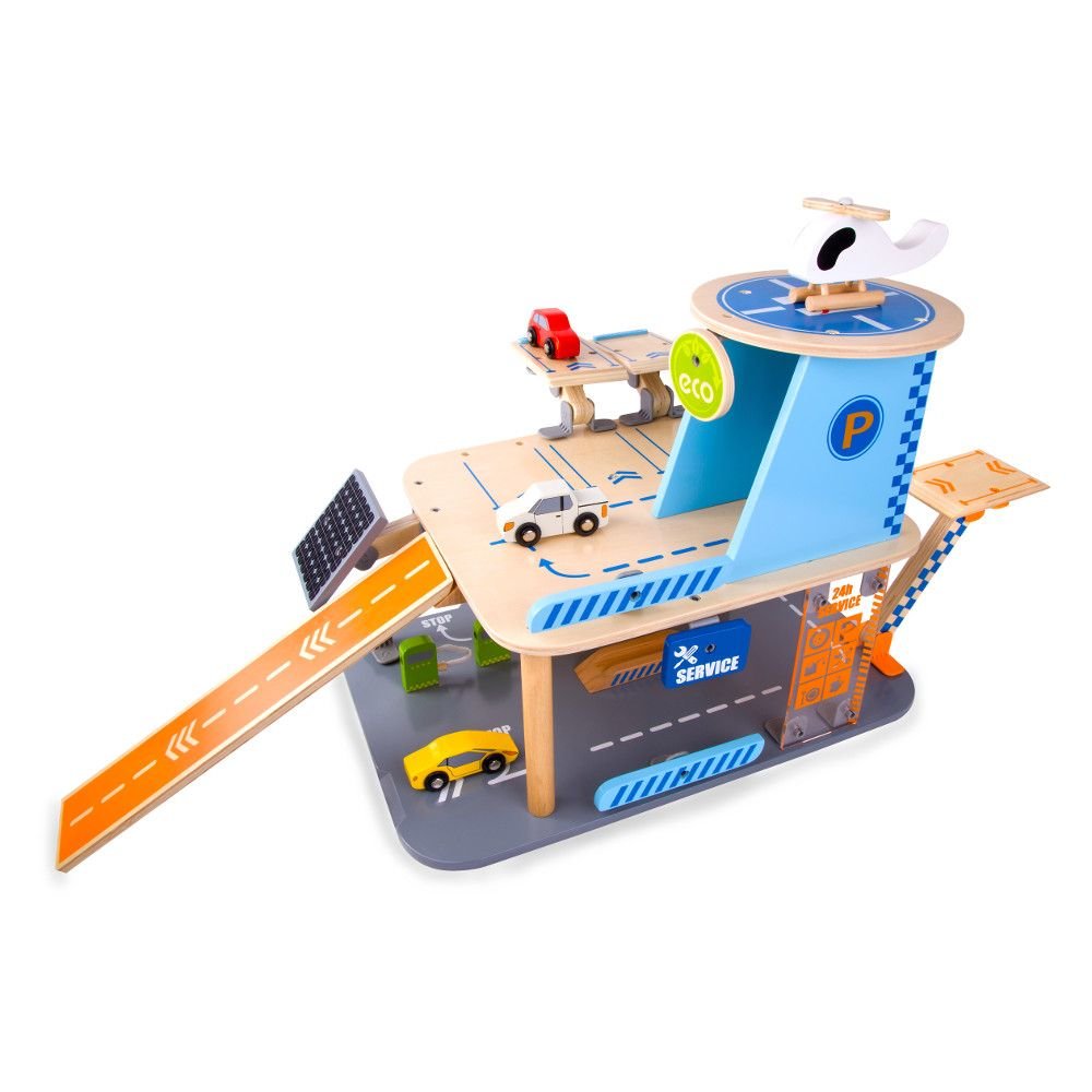 Детски двуетажен гараж с хеликоптерна площадка, изработен от екологична дървесина. Гаражът е пригоден с рампа, както и разполага със соларна система, място за обслужване на коли, автомивка и колонка за зареждане на гориво. В комплекта са включени и 2 колички, 1 пикап и 1 хеликоптер.