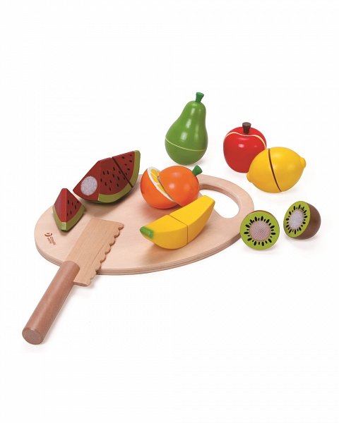 Детски дървен комплект съдържащ удобна дъска за рязане, нож и 7 различни плода – банан, парче диня, киви, портокал, лимон, круша, ябълка, които могат да бъдат многократно разрязвани. Този комплект е едно чудесно допълнение към приборите и продуктите в кухнята от тази серия. Всеки един от плодовете се състои от няколко части, които са съединени помежду си с велкро. Те могат лесно да бъдат нарязани с помощта на дъската и ножа. Играта с този комплект ще позволи на децата да усвоят основните правила на рязането, както и да се научат да ги разпознават и ползата от здравословното хранене с тях. Подходящи са и за игра в детски градини и парти центрове.