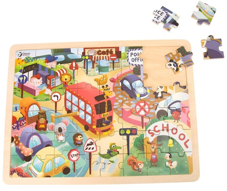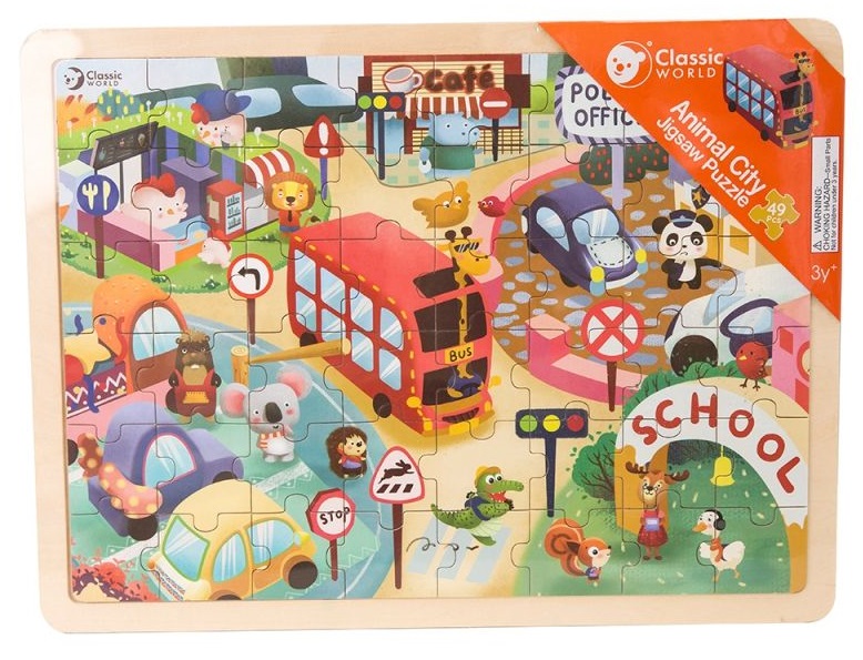 Детски дървен пъзел съдържащ 48 елементи, с които децата ще се подредят весела картина с животни. Частите от пъзела се побират в удобна рамка. Подобни илюстрации с ярки ефекти стимулират въображението на малкото дете, докато подрежда частите.