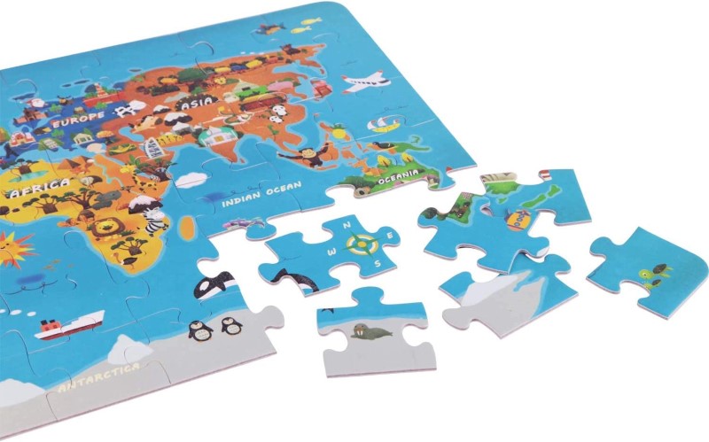 Този пъзел с картата на света ви учи кои животни и пейзажи принадлежат на всеки континент! Пъзелът се състои от 48 части.