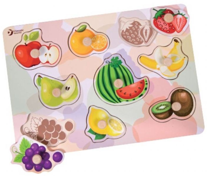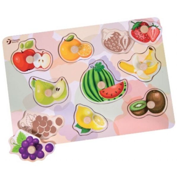 Детски дървен пъзел съдържащ 9 различни плодове. Пъзелът е лесен за нареждане от малчуганите, благодарение на удобните дръжки за хващане от малките им ръчички. Играта с него развива фината моторика и концентрацията на децата.
