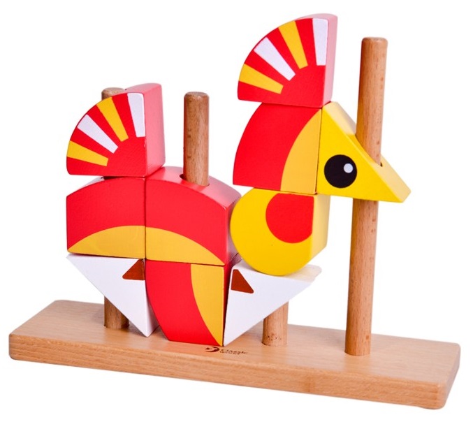 Комплектът съдържа поставка за подреждане, 12 цветни дървени блокчета и няколко карти с примери.