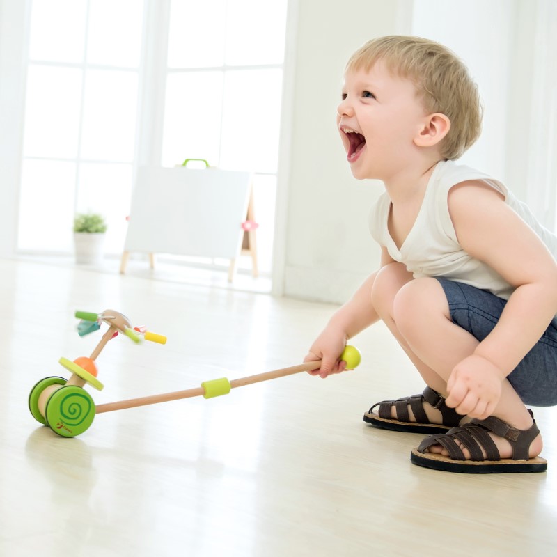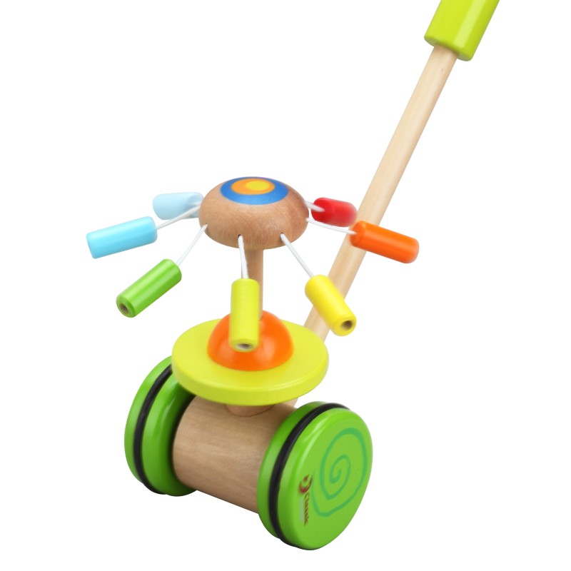 Занимателна играчка за дърпане и бутане с изключителен дизайн и качество на изработка. Когато играчката се движи, листата на цветето започват да се въртят. Това движение насърчава децата да се движат повече. Истинско удоволствие е да наблюдавате децата си как се забавляват. Играта с тази играчка за бутане ще стимулира децата да тичат след нея, като същевременно те ще тренират своята координация, баланс и двигателни умения. С тази играчка, вашите деца ги очакват часове на забавления, както и ще им осигури чудесна форма и физическа активност. Подходяща е и за игра на открито.