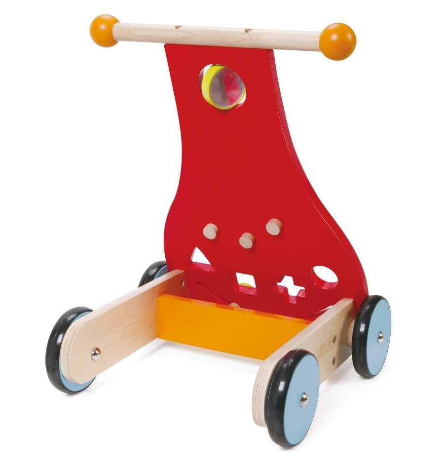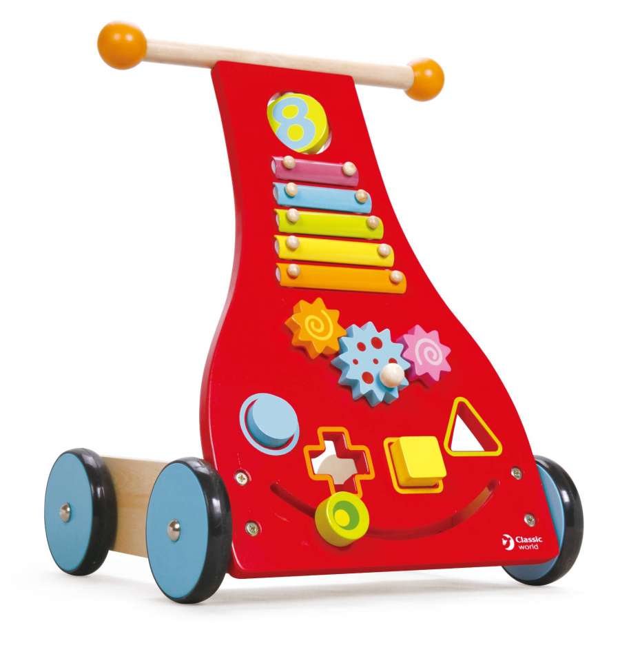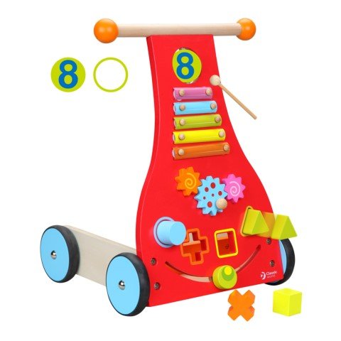 Практична и удобна детска проходилка – уокър, която ще помогне на детето Ви да направи първите си крачки. Тя е изключително забавна, благодарение на занимателните игри, които са вградени върху нея – ксилофон, 3D формички за сортиране, огледало, зъбни колела и отделение за играчки, които я правят чудесен избор за всяко дете, докато расте и опознава света на забавленията. Колелата и са гумирани и осигуряват надеждна база за децата докато я бутат, дърпат и същевременно се опитват да ходят. Проходилката е изработена от здрав дървен материал, с покрити с гума колела, което