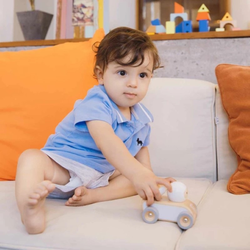 Дървена количка с космонавт, перфектно проектирана за хващане от малките ръчичките. Бутането на количката по пода напред и назад помага на децата да упражняват сръчността на пръстите си и развива координацията око-ръка. Може да се движи по различни повърхности, което я прави подходяща и за игра навън.